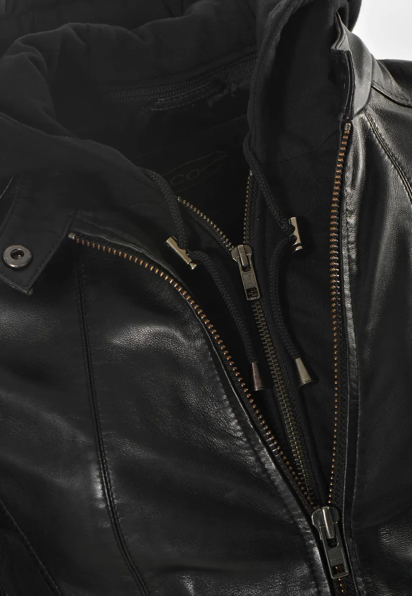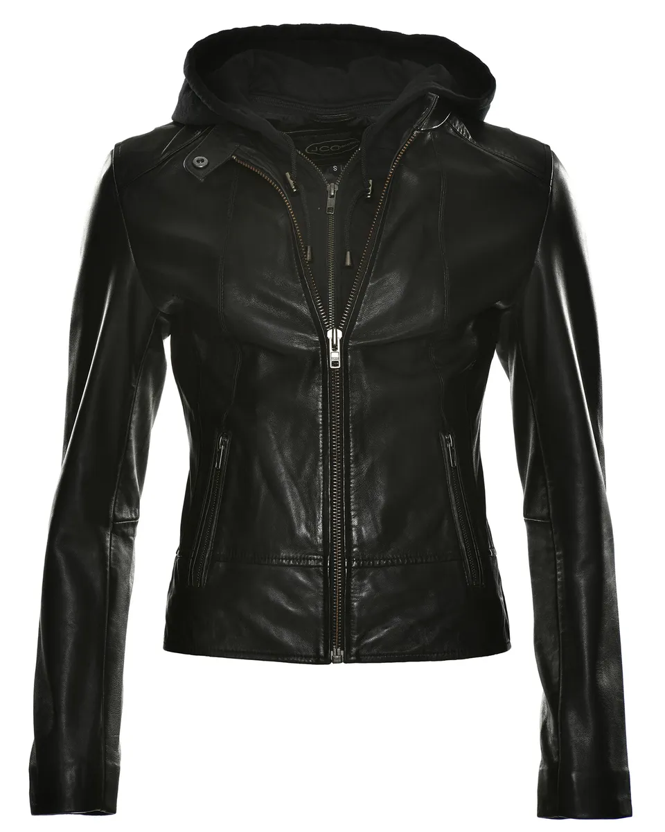 Стильная кожаная куртка от модного бренда JCC. Куртка имеет спортивный крой и удобна в носке благодаря мягкой внутренней подкладке. Есть два боковых кармана на молнии. Капюшон из хлопка снимается на молнии. Для фиксации имеется шнурок.Вырез: нетОсобенности: нетОтбеливание: Не отбеливатьСтрана происхождения: ИндияПроизводитель: JCCКоллекция: Весна / Лето 20Форма воротника: капюшонТип кожи: ягненокСостав материала: Внешний материал: 100% кожа, ягненок/капюшон: 100% хлопок / подкладка: 100% полиэстерДлина: обычнаяМатериал подкладки: полиэстерМатериал подкладки (двойная снимается): синтетическое волокноМатериал внешней ткани: гладкая кожаПримечание к материалу: нет/не актуальноВыкройка: однотоннаяПосадка: индивидуальнаяТип/стиль изделия: курткаДлина спины: около 53 см для размера. SСезон: всесезонная вещьПодол: прямой Тип застежки: молнияНабивка: нет/не актуальноЦелевая группа: женщиныДлина рукава: длинный рукавФильм рукава: нет/не актуальноИнструкция по уходу: Специальная чистка кожи