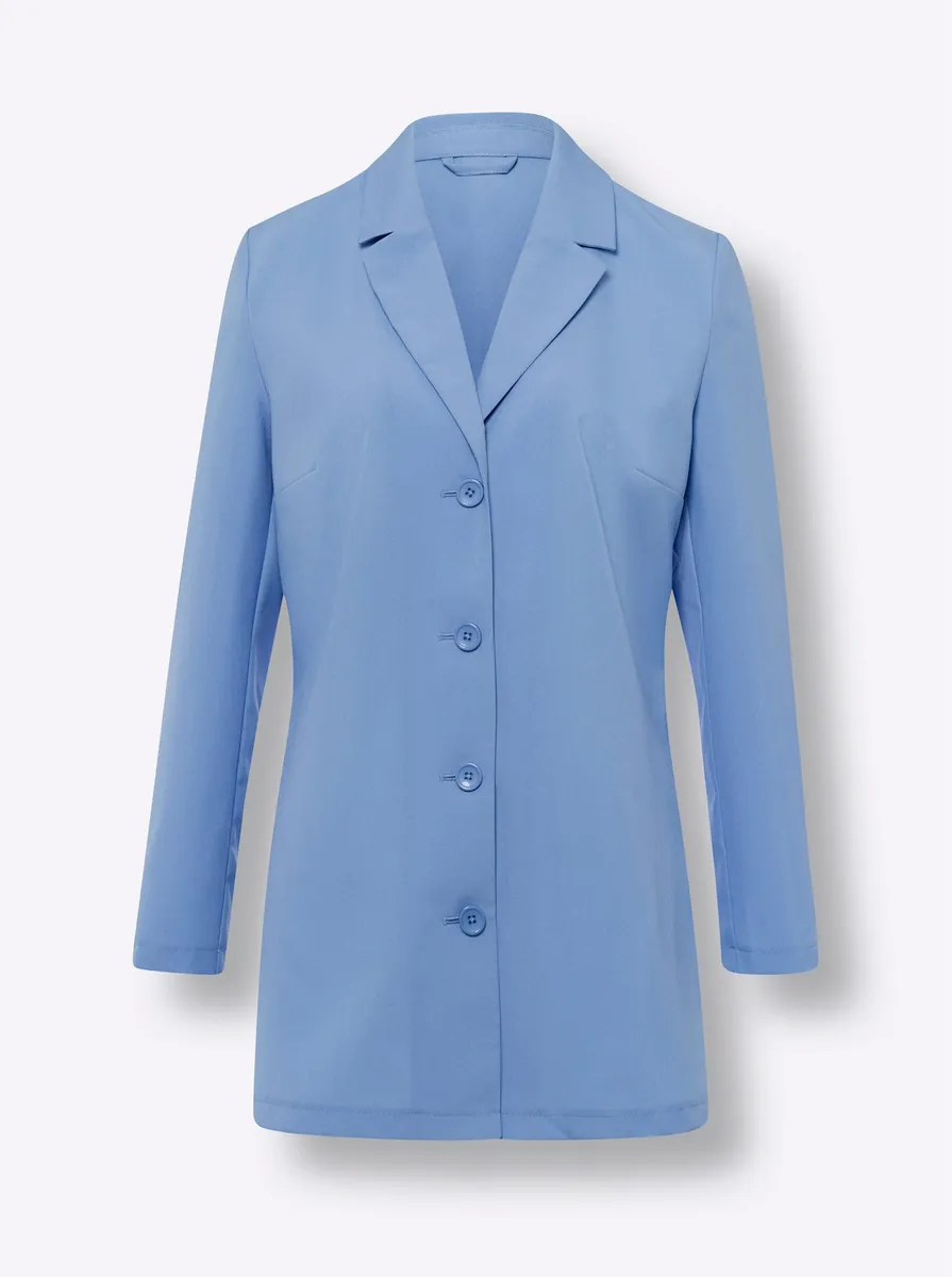 Модный брючный костюм удобного удлиненного кроя. Визуально вытягивающийся воротник с лацканами, вытачки на груди и планка на пуговицах. Брюки с удобным эластичным поясом по всему периметру и фигурными вытачками сзади. Экстравагантные высокие разрезы по бокам. 100% полиэстер. Машинная стирка.