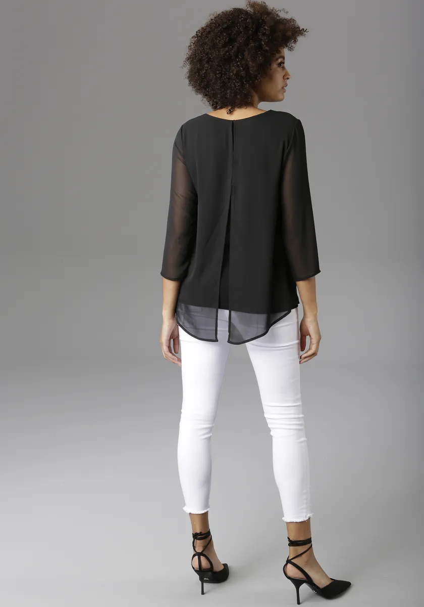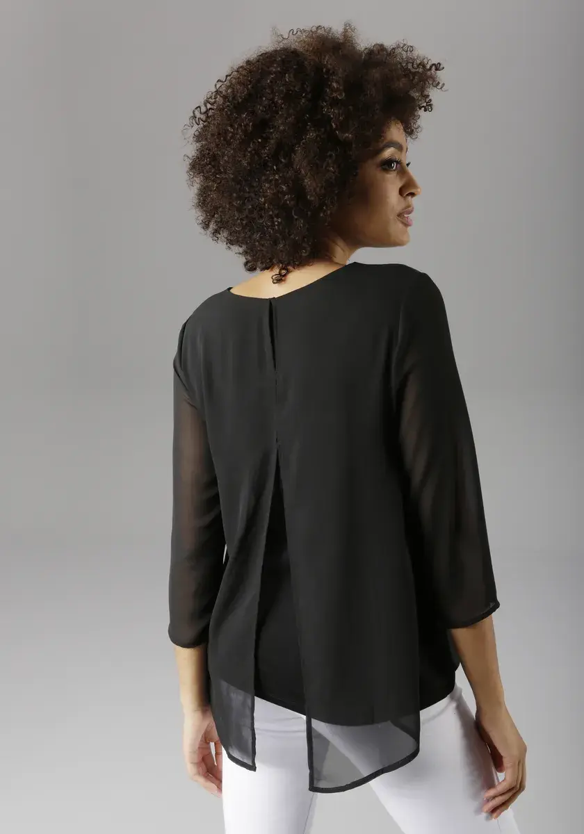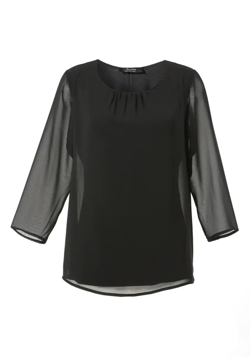 Шифоновая блузка Aniston SELECTED на трикотажной подкладке. С прозрачными рукавами длиной 3/4. Eyecatcher: С разрезом сзади. Инкрустированные складки на круглом вырезе. Машинная стирка.