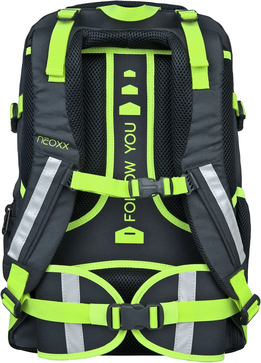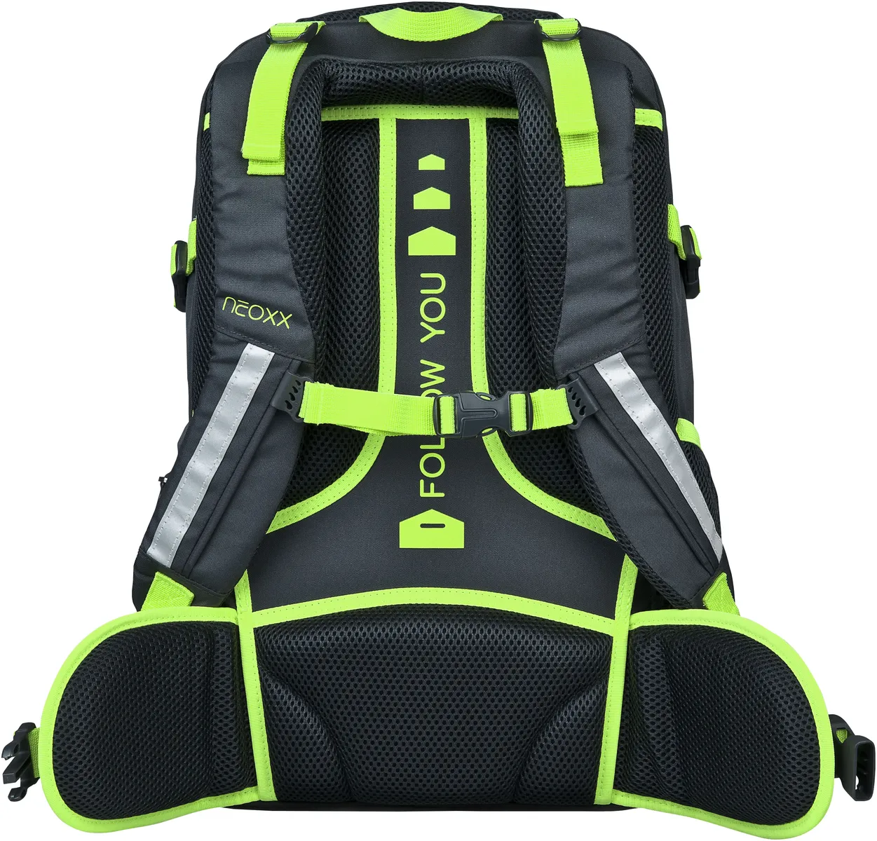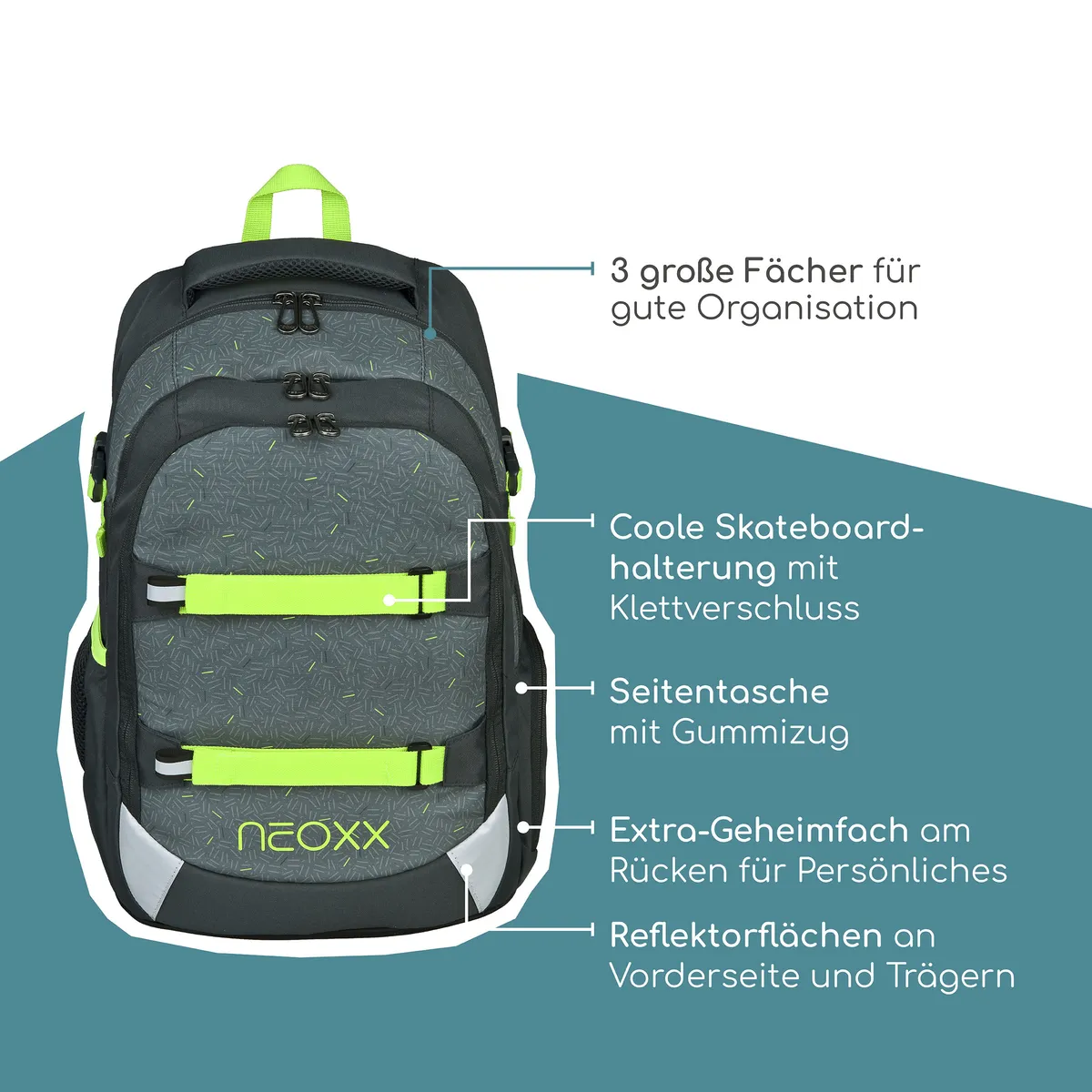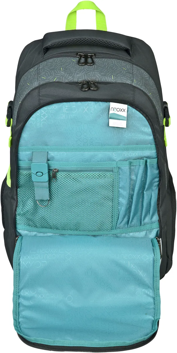 Школьный рюкзак neoxx «Active Pro» — ваш идеальный спутник с 5-го класса. Школьный рюкзак Active Pro предлагает достаточно места для хранения всех ваших вещей: благодаря объему около 26 литров в него поместится много вещей. Имеется большое отделение с органайзером для ноутбука, место для объемных папок и отдельное отделение для блокнотов. В переднем отделении имеется практичный сетчатый органайзер, петли для ручек и шнурок. Боковые отделения на молнии и резинке позволяют разместить бутылки или другие вещи, которые вы хотите иметь под рукой. Школьный рюкзак Active Pro также обеспечивает высочайший уровень комфорта. Благодаря мягкой спинке и регулируемым по высоте мягким лямкам его можно носить с комфортом. Съемный поясной ремень обеспечивает дополнительную нагрузку на спину, а нагрудный ремень равномерно распределяет вес. Ремни для регулировки положения и боковые компрессионные ремни позволяют расположить вес близко к спине. Чтобы вас было хорошо видно в пробке, школьный рюкзак Active Pro имеет тонкие светоотражающие поверхности спереди и на лямках. Рюкзак изготовлен из водоотталкивающих и прочных материалов, поэтому он сможет сопровождать вас в любой ситуации. Со школьным рюкзаком neoxx Active вы также вносите вклад в защиту окружающей среды. Внутренняя подкладка школьного рюкзака Active Pro изготовлена ​​из 100% переработанных ПЭТ-бутылок. На каждый рюкзак перерабатывается примерно 13 бутылок. Кроме того, neoxx в сотрудничестве с Turtle Foundation помогает морским черепахам вылупляться в безопасной среде.