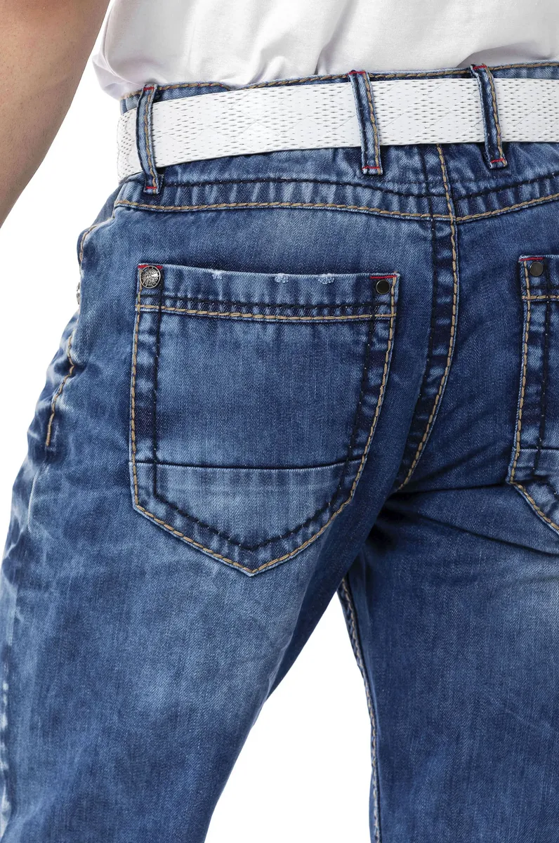 Удобная посадка благодаря стандартной посадке, идеально подходит для повседневного ношения. Прочный джинсовый материал: хлопок для долговечности и комфорта. Джинсы обычного кроя с потертостями для создания аутентичного винтажного образа. Классическая джинсовая ткань идеально подходит для универсальных вариантов укладки. Практичное разнообразие карманов: боковые карманы, карман для монет и задние карманы.