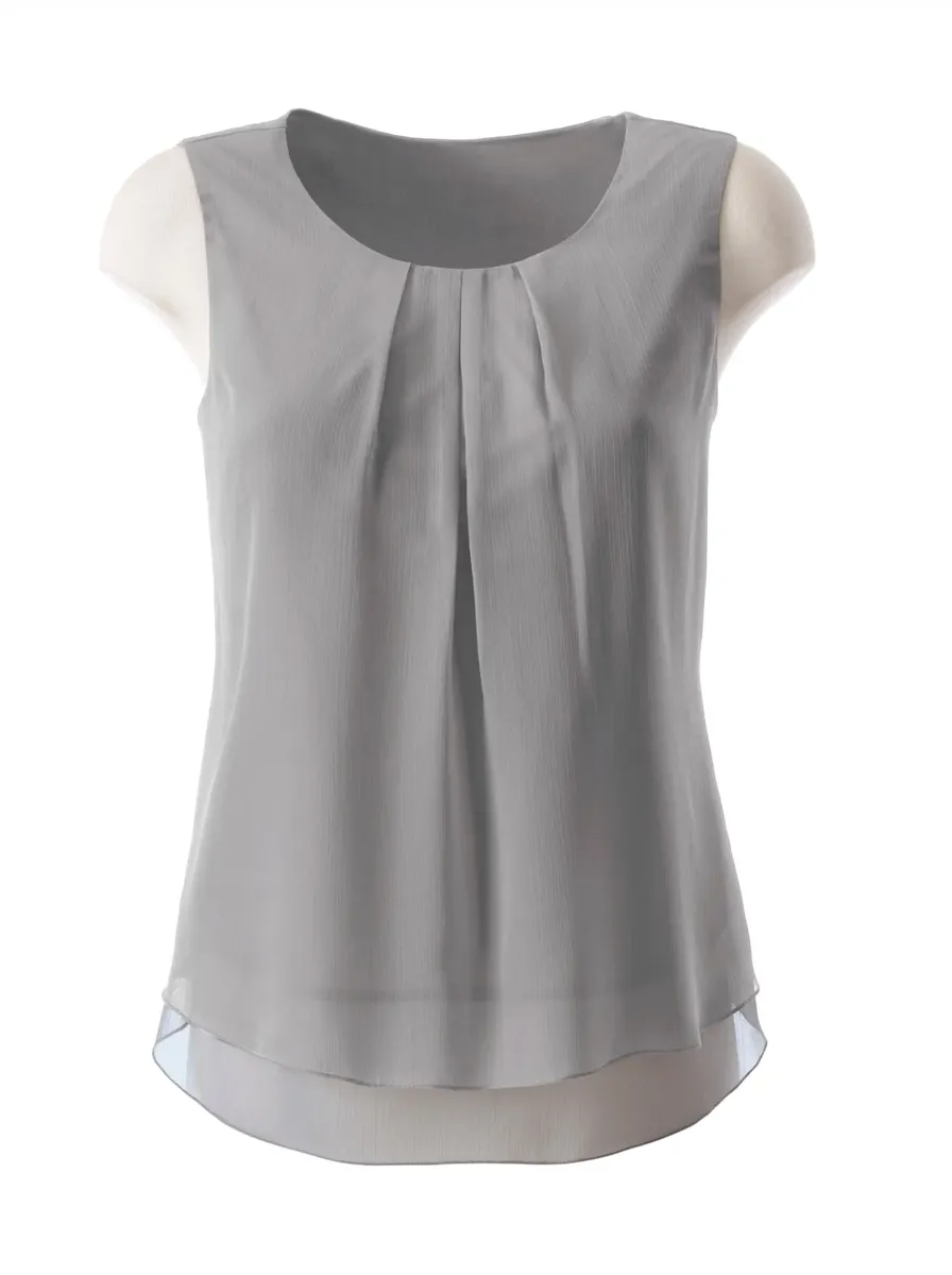 Очаровательный верх блузки: два слоя уменьшают прозрачность, но не привлекательность. Складка спереди на круглом вырезе. Ароматный креп-жоржет высокого качества. 100% полиэстер. Машинная стирка.