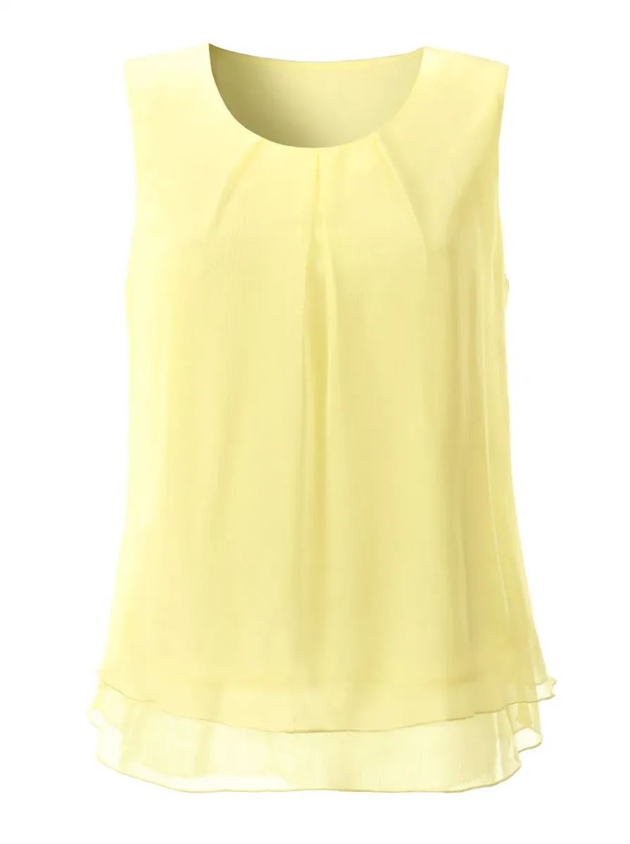 Очаровательный верх блузки: два слоя уменьшают прозрачность, но не привлекательность. Складка спереди на круглом вырезе. Ароматный креп-жоржет высокого качества. 100% полиэстер. Машинная стирка.