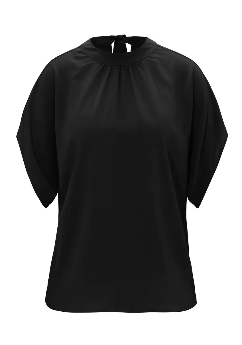 Очень широкая однотонная блузка от Aniston Selected. Короткий воротник-стойка со складками спереди и разрезом и завязкой сзади. Перерез плеч. Кефаль – сзади длиннее, чем спереди. Длина по переду в 36 размере около 62см, по спинке около 66см. Качество крепа. Машинная стирка.