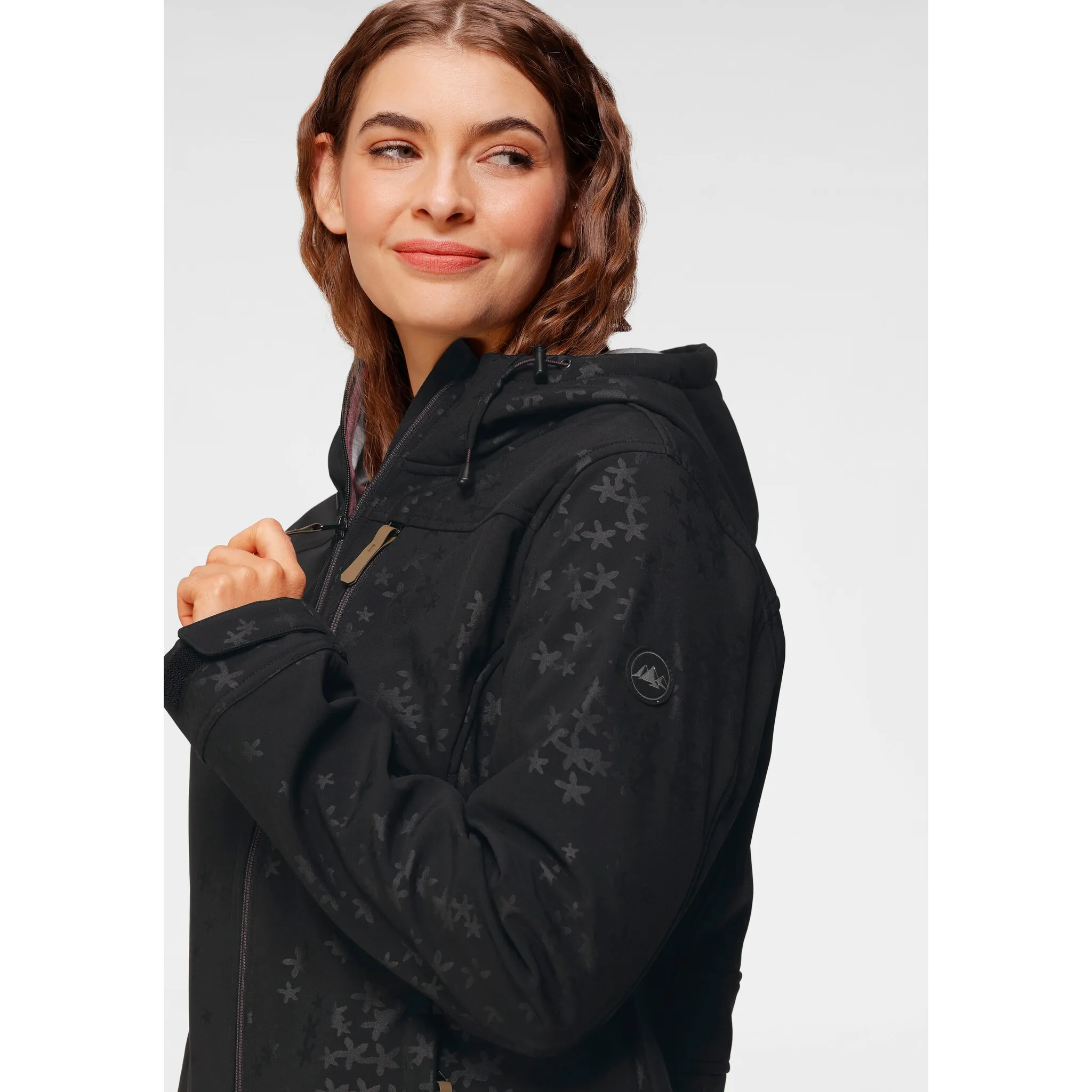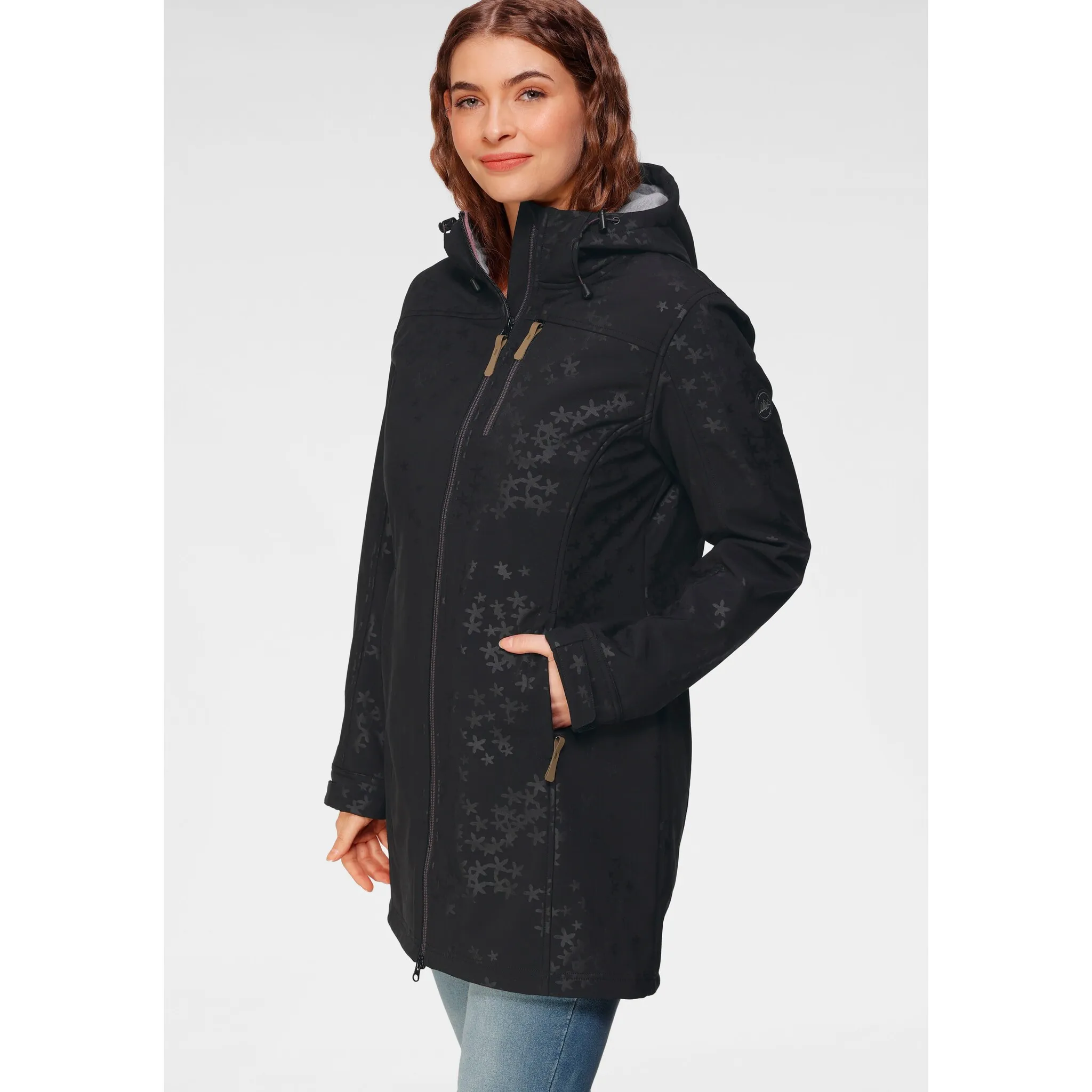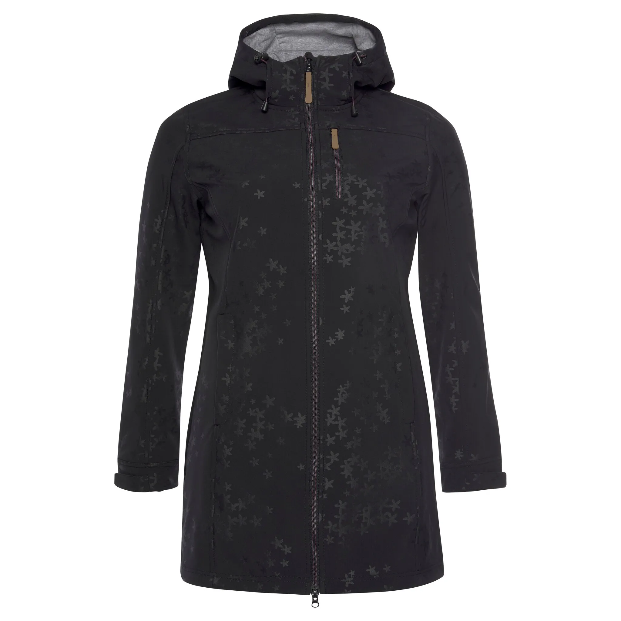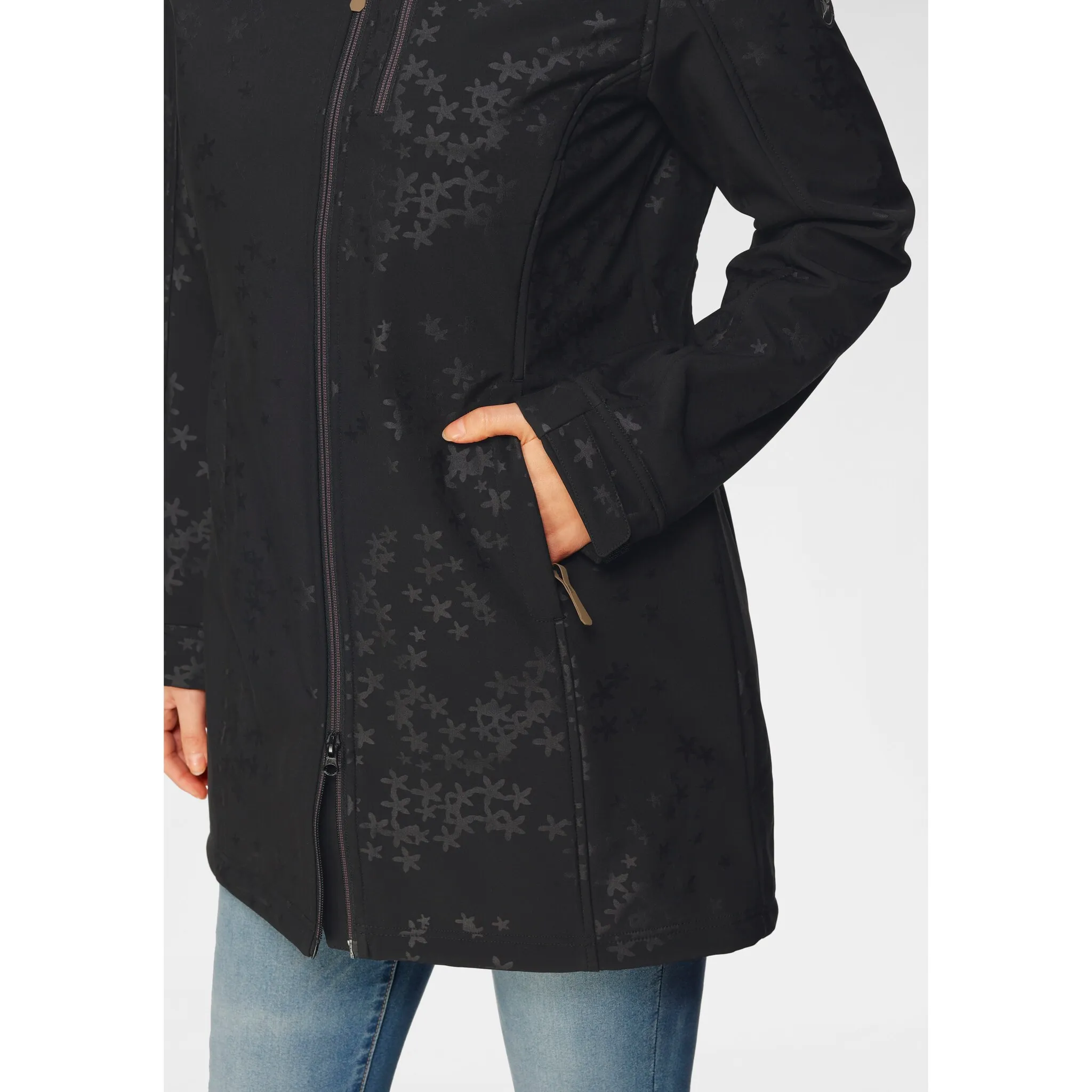 Пальто из софтшелла со сплошным рисунком от Polarino. Капюшон на шнурке. Двусторонняя молния с защитой подбородка. Передний карман на молнии и боковые карманы. Ремни-липучки по краям рукавов. Эластичный, дышащий, водо- и ветроотталкивающий материал с мягким флисом внутри.