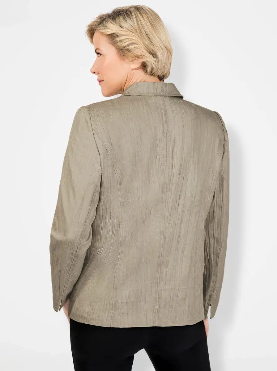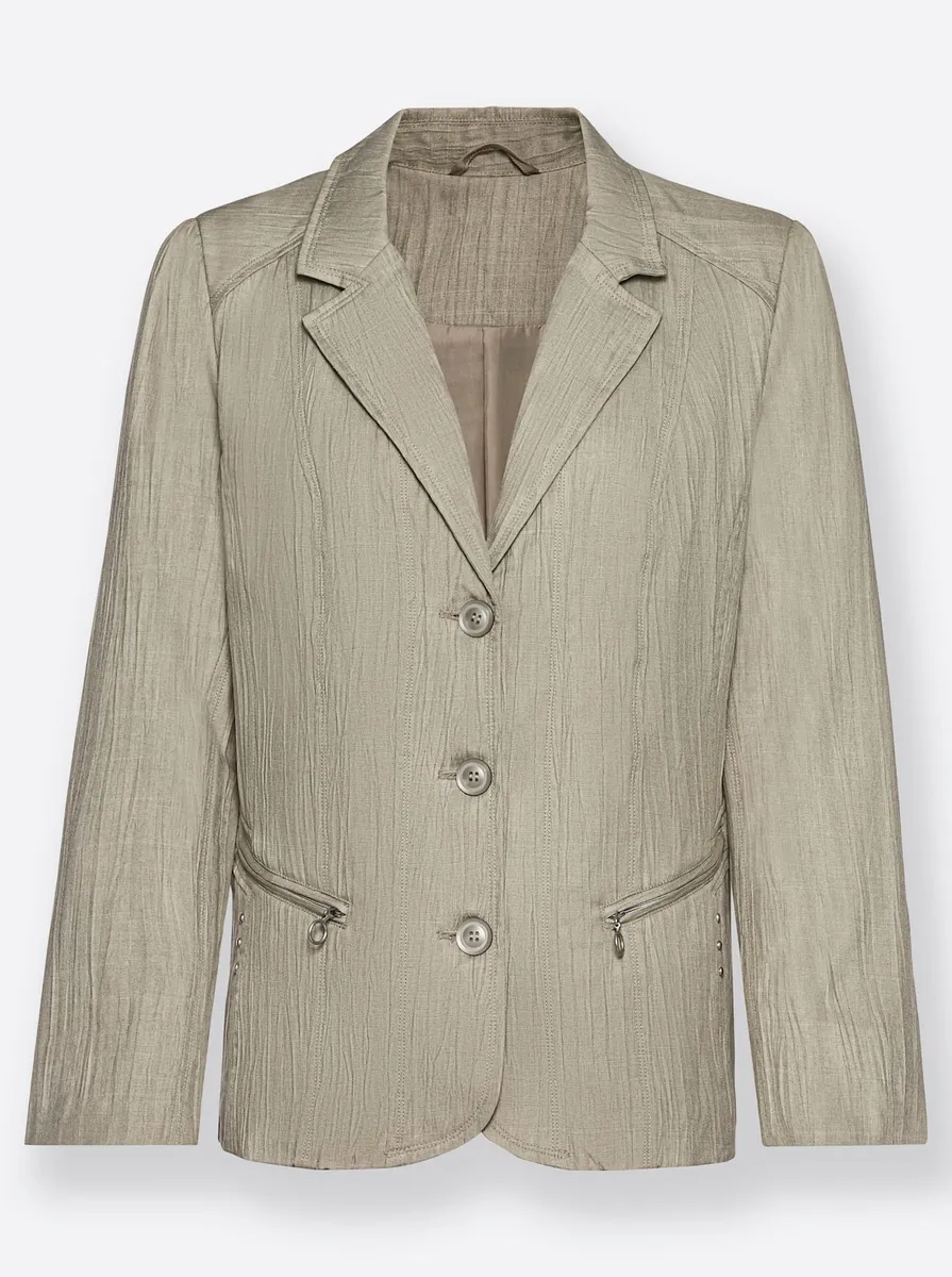 Модный партнер по сочетанию: блейзер легкого кроша. Воротник с лацканами, скошенная кокетка на плечах и фигурные швы спереди и сзади. Косые прорезные карманы на молнии. Подвернутые манжеты. 100% полиэстер. Подкладка: 100% полиэстер. Машинная стирка?