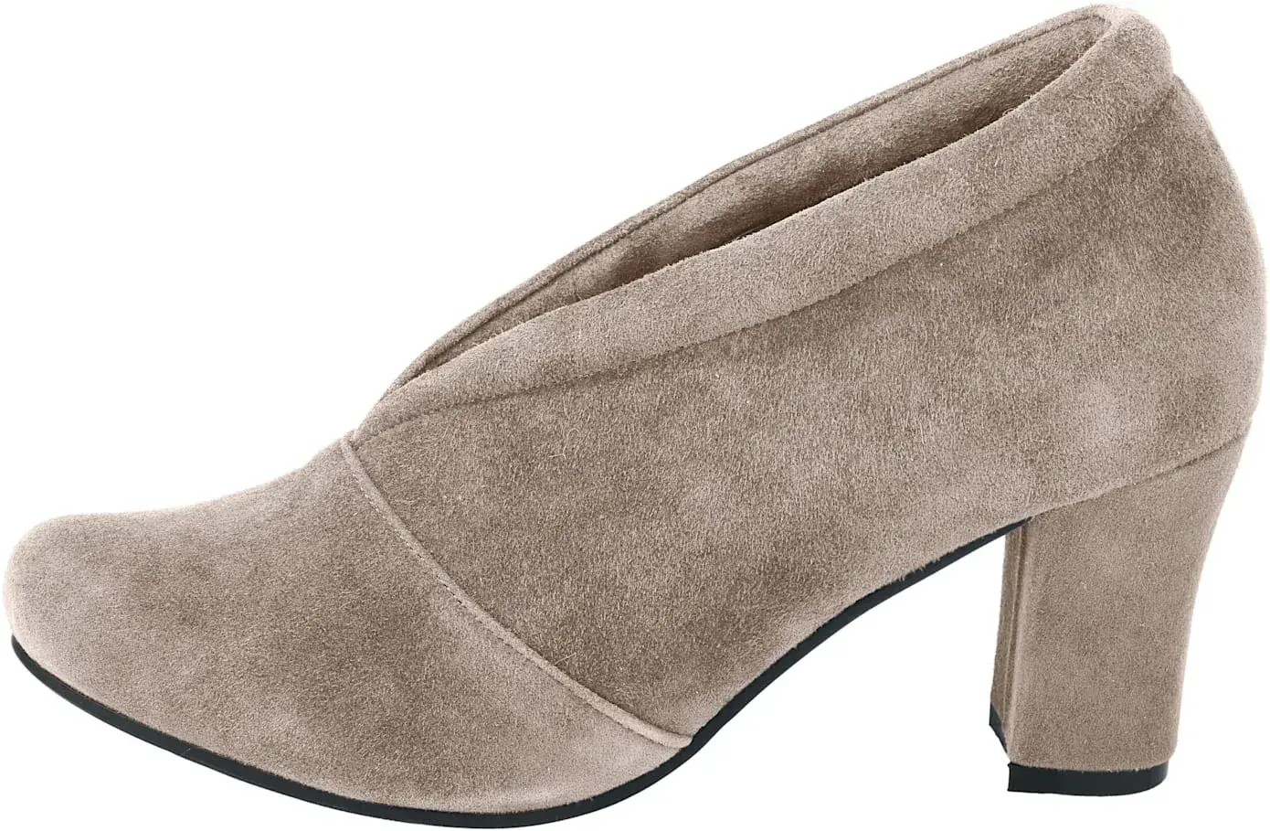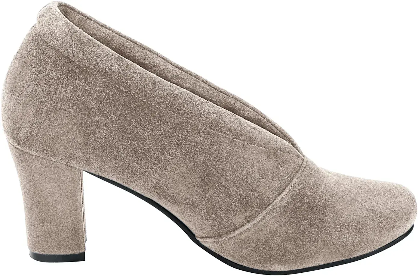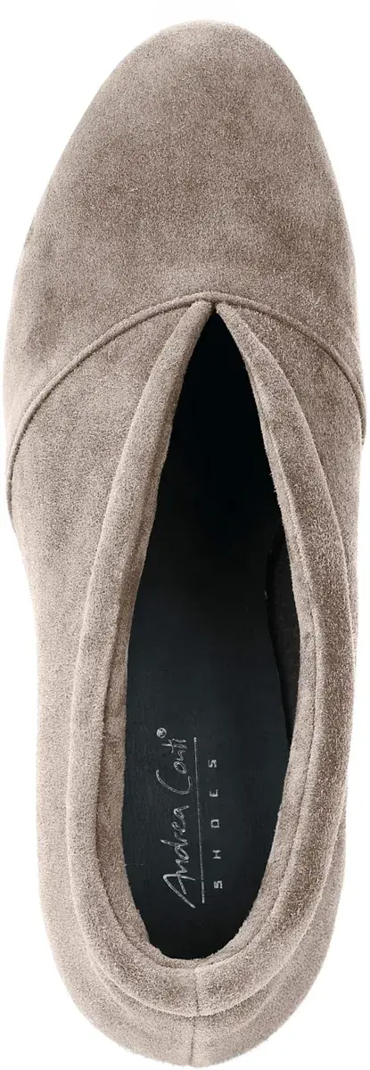 Экстравагантные туфли-лодочки с приподнятыми краями и блочным каблуком. Модель из мягкой козьей замши. Бежевый металлик из козьей кожи со змеиным эффектом. Подкладка: искусственная кожа, стелька: кожа. Высота каблука около 65 мм.