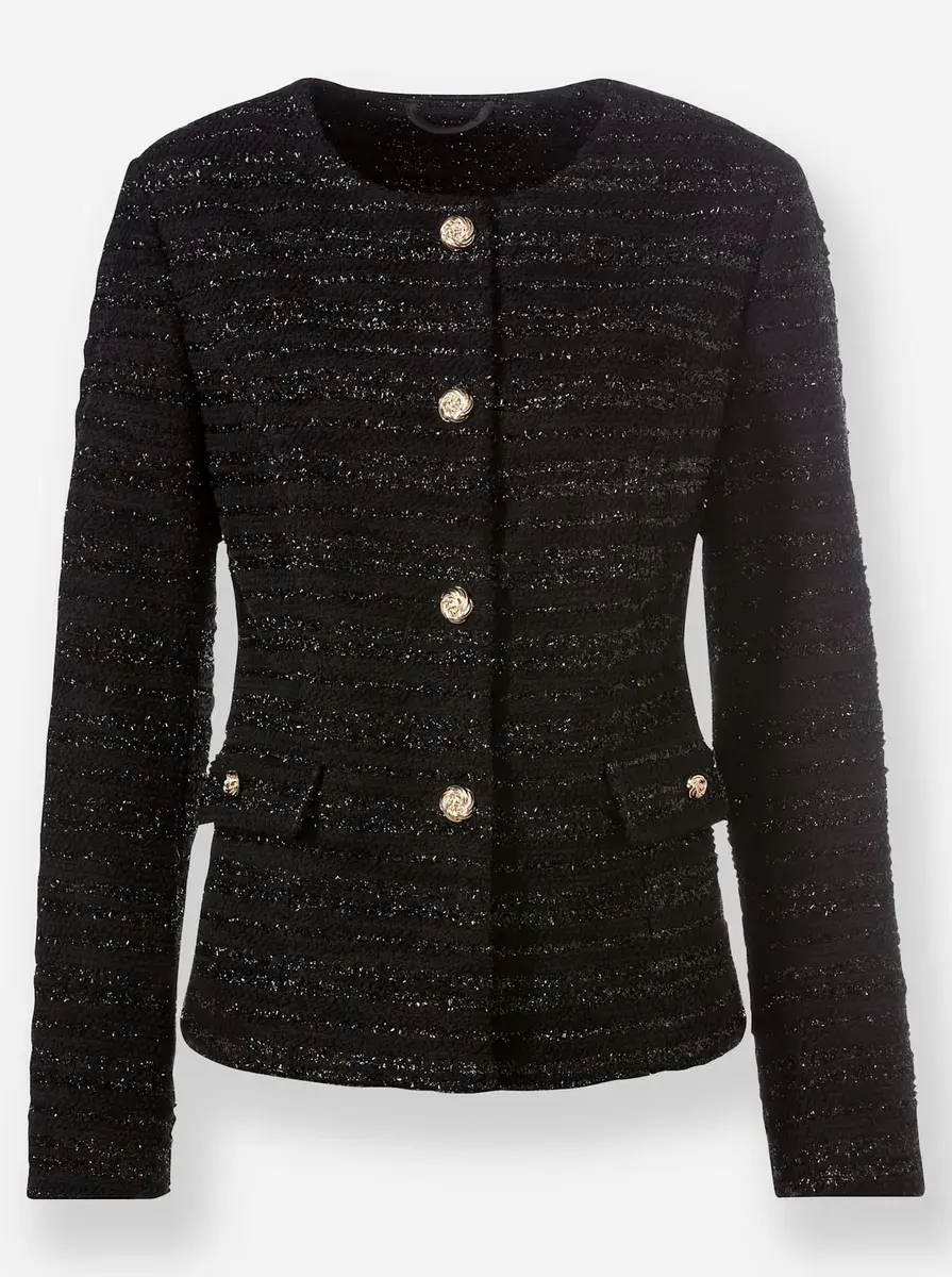 Пиджак из джерси Идеальный стиль, сочетающийся с модным структурированным узором. Элегантный вид, пряжа с блестящим эффектом и планка с декоративными пуговицами золотого цвета. Круглый вырез. Карманы с клапанами. Длинный рукав. 100% полиэстер. Подкладка: 100% полиэстер. Машинная стирка.