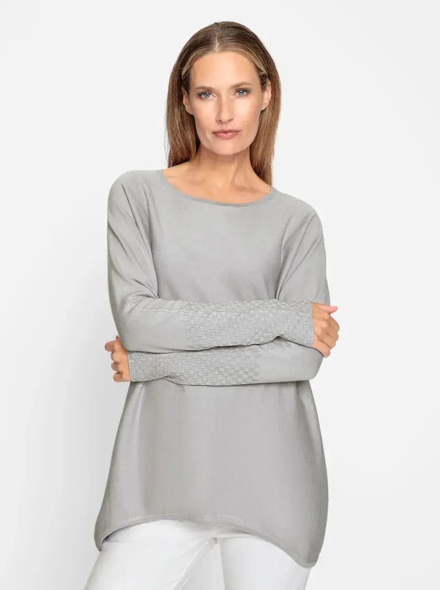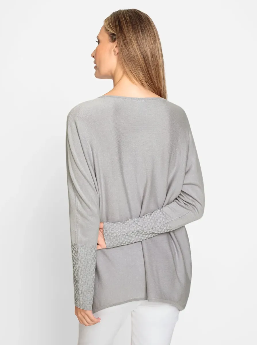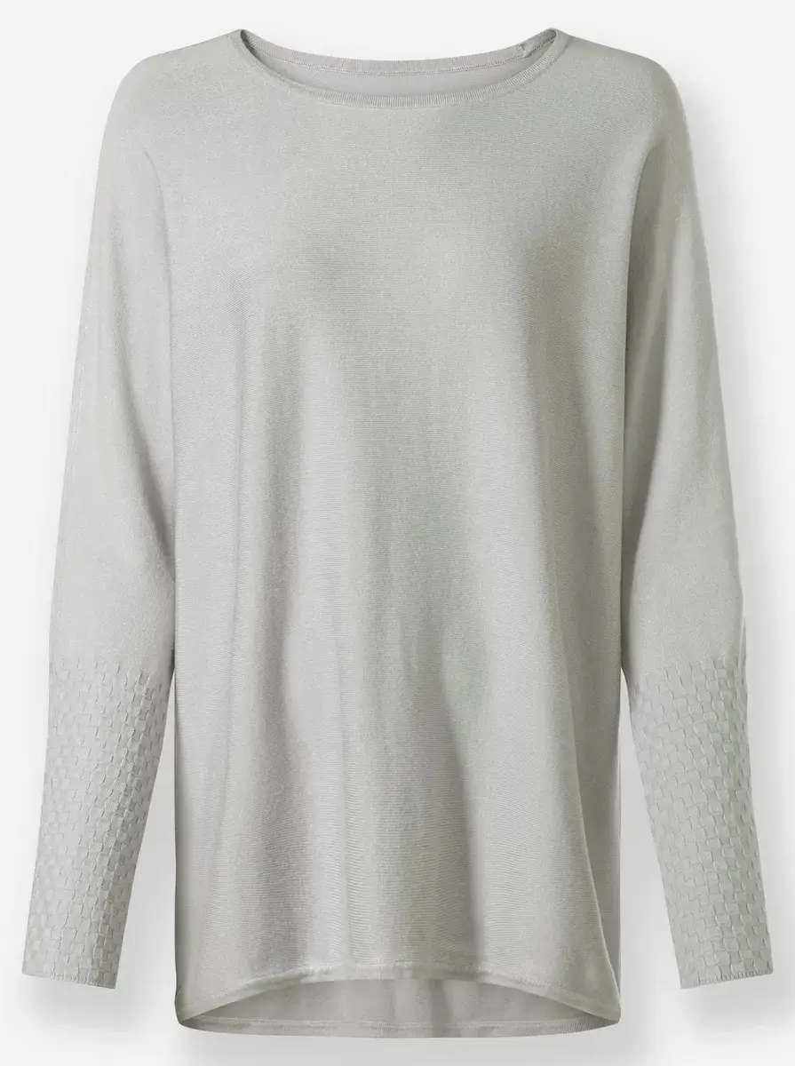 Модный свитер с асимметричным зауженным краем сбоку. С круглым вырезом. Длинные рукава «летучая мышь» с эффектной структурированной вязкой на конце. Мягкое, эластичное качество. 70% вискоза, 30% полиамид. Машинная стирка.