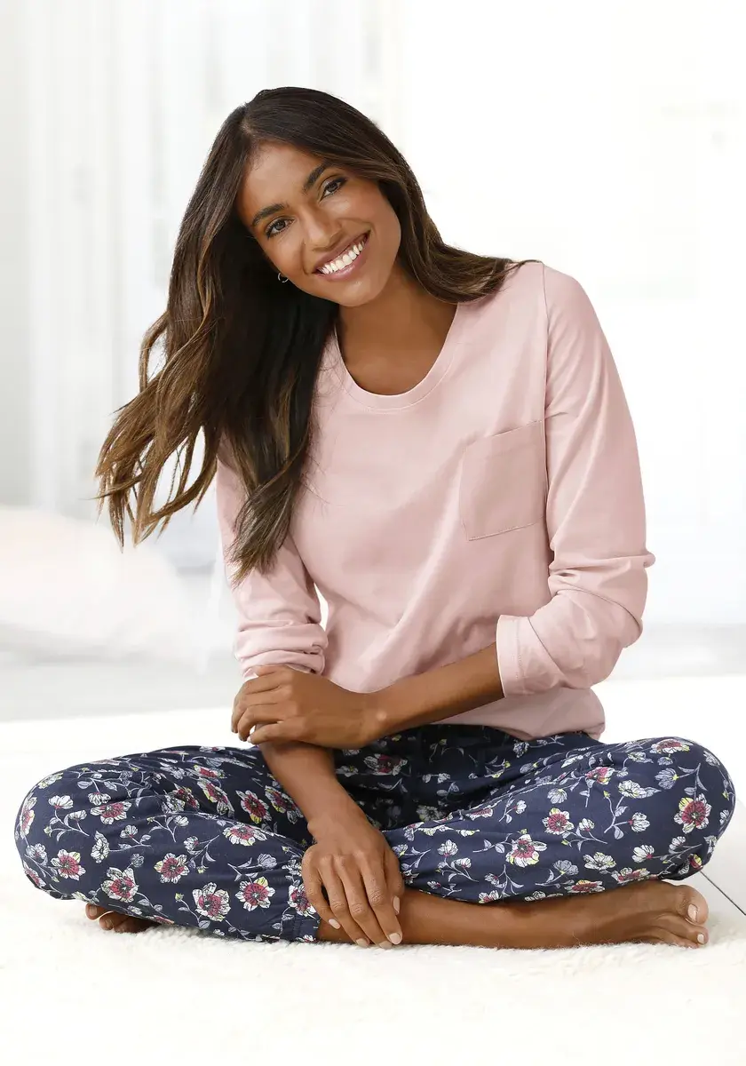 Пижама Vivance Dreams с графическим принтом. Однотонная рубашка с длинными рукавами, круглым вырезом и накладным нагрудным карманом. Брюки с принтом по всей поверхности и эластичным поясом на кулиске. Внешний материал: 100% хлопок (поддерживает хлопок, произведенный в Африке).