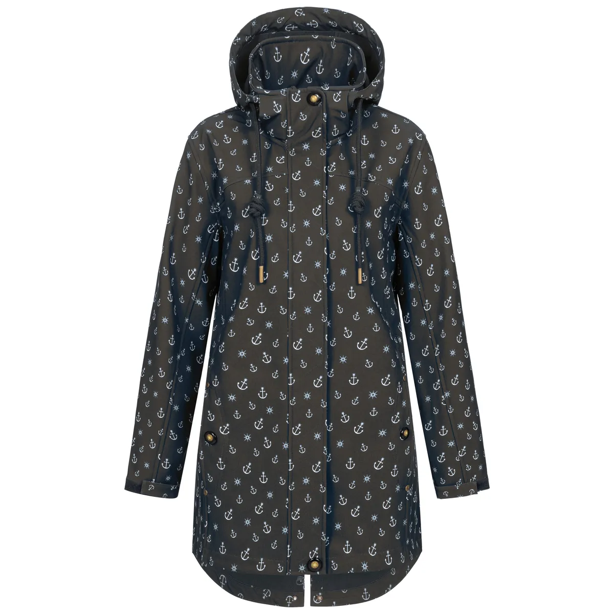 Новое женское пальто из софтшелла ANKERGLUTSCHEIN – идеальный спутник в повседневной жизни, для спокойных походов или прогулок в парке. Качественный функциональный материал без проблем защищает от ветра и небольшого дождя. Благодаря высокому содержанию эластана он идеально адаптируется к телу и обеспечивает достаточную свободу движений. Внутри имеется утепляющая флисовая подкладка. Короткое пальто умело облегает бедра. Объём талии также можно регулировать с помощью потайного шнурка. Пальто из софтшелла ANKERGLUT со съемным капюшоном, регулируемыми манжетами на рукавах и двусторонней молнией имеет и другие важные особенности. Два внешних кармана закрываются на молнию. Мотив якоря придает парке из софтшелла удивительный морской характер. Любимые детали лейбла, такие как нашивки на рукавах, необычные кнопки и игривые шнуры, дополняют морской вид парки из софтшелла.