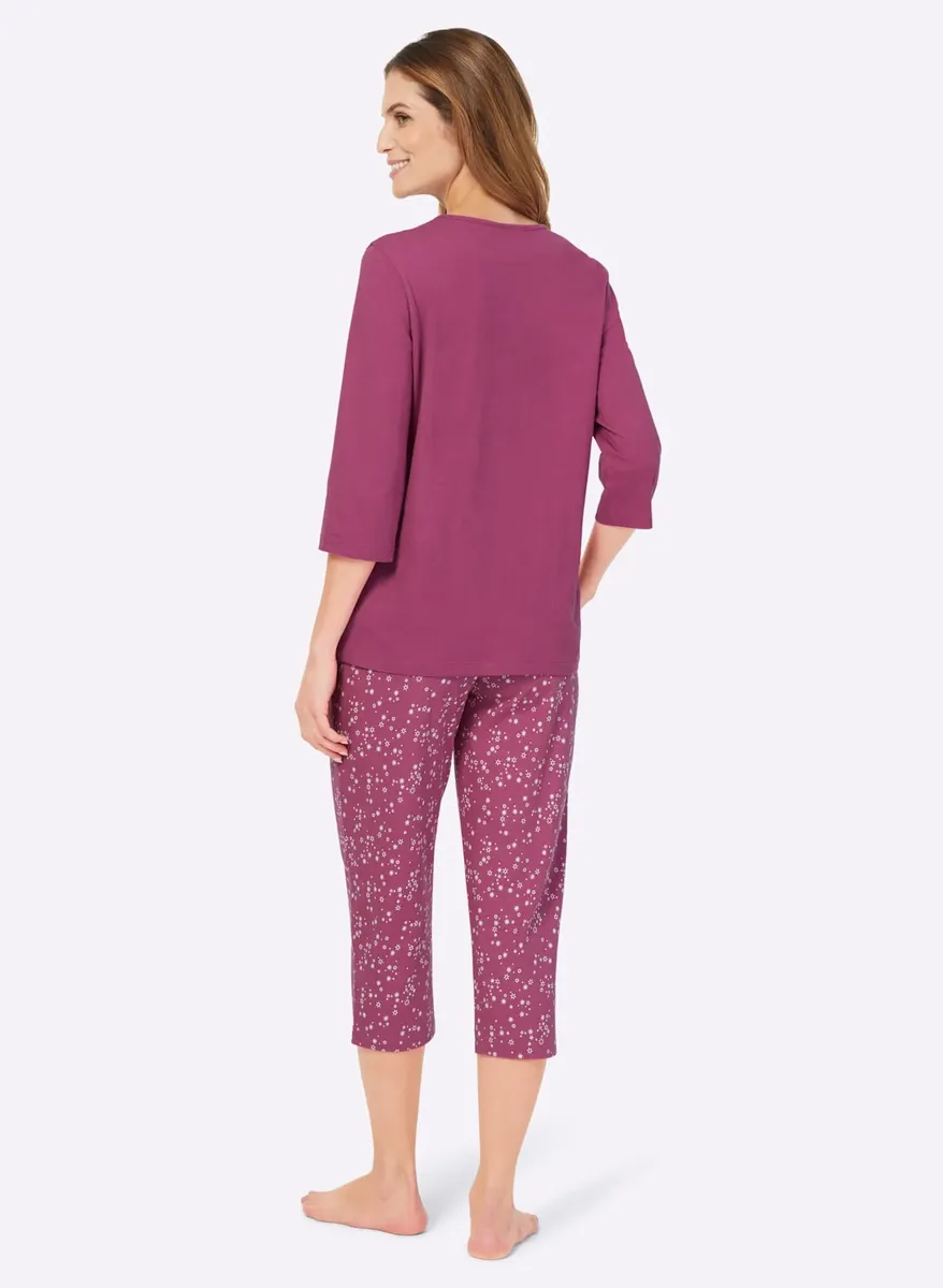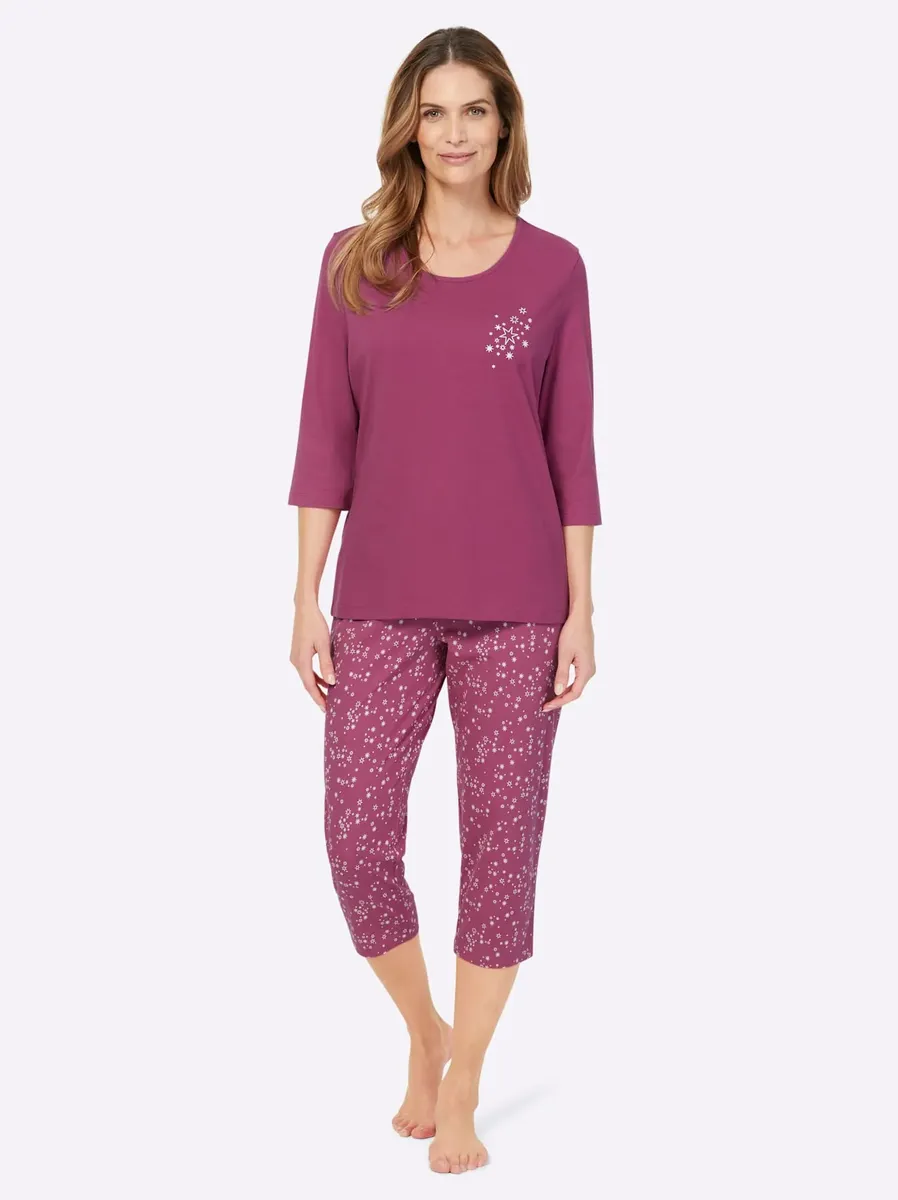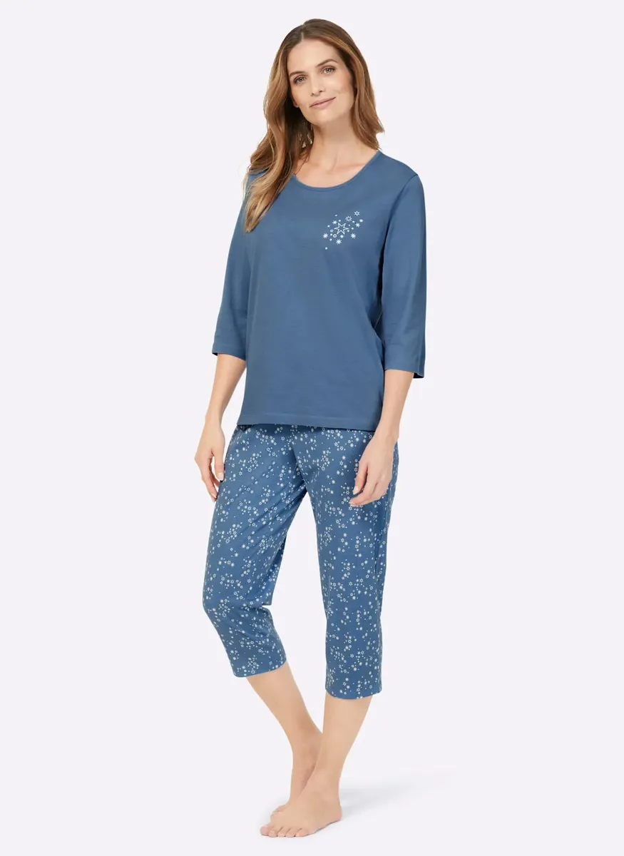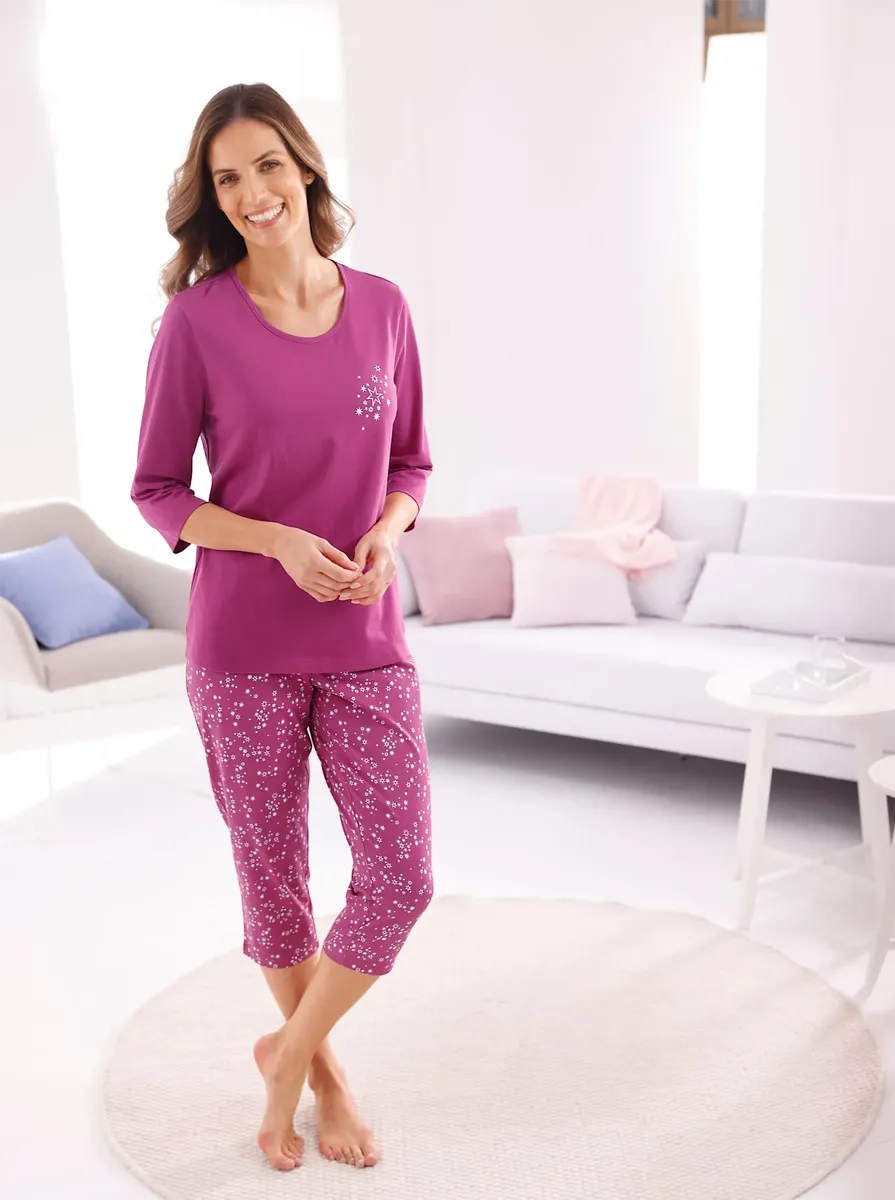 Пижама в практичной двойной упаковке! Топы с принтом спереди, круглым вырезом с кантом и рукавами 3/4. Брюки длиной 3/4 со сплошным принтом, удобным эластичным поясом по всему периметру и прямыми манжетами. Одинарный трикотаж от компании Waschpur. Совершая покупку, вы поддерживаете инициативу «Хлопок, сделанный в Африке». 100% хлопок.