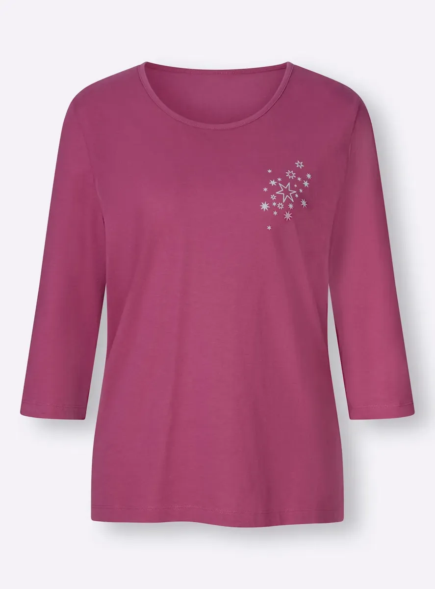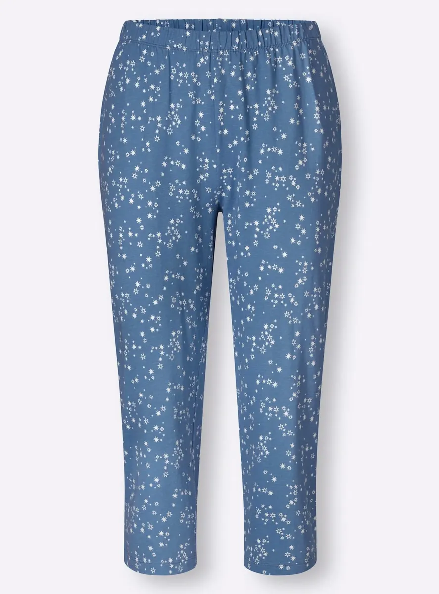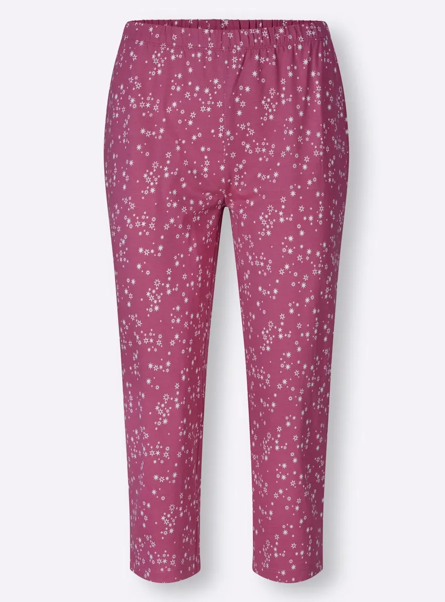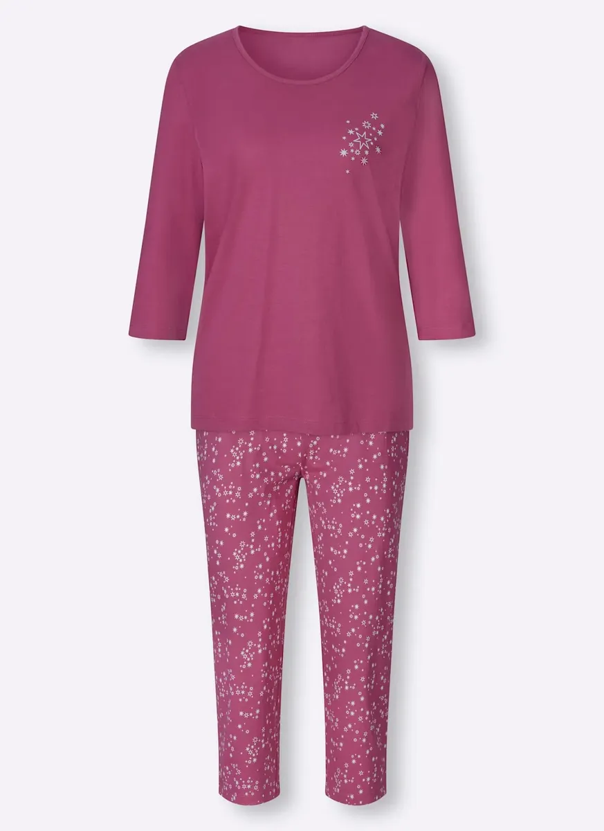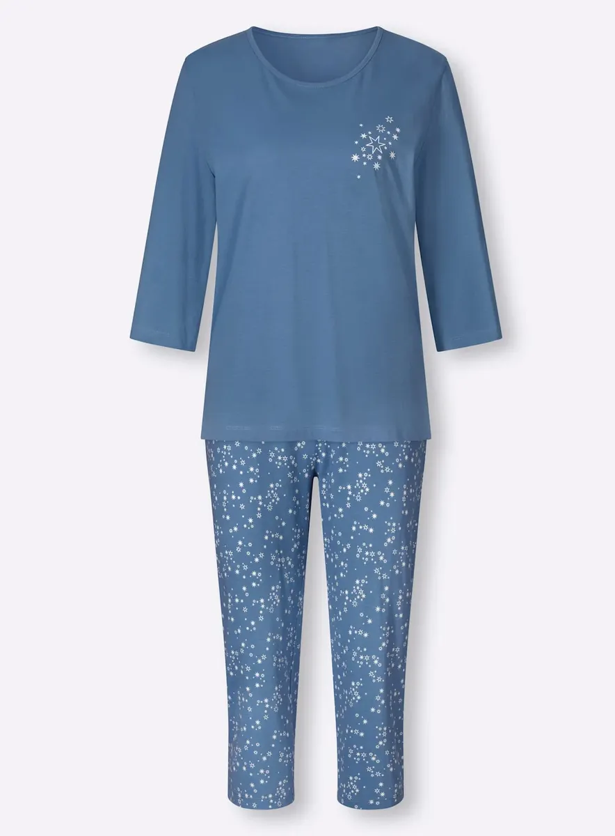 Пижама в практичной двойной упаковке! Топы с принтом спереди, круглым вырезом с кантом и рукавами 3/4. Брюки длиной 3/4 со сплошным принтом, удобным эластичным поясом по всему периметру и прямыми манжетами. Одинарный трикотаж от компании Waschpur. Совершая покупку, вы поддерживаете инициативу «Хлопок, сделанный в Африке». 100% хлопок.