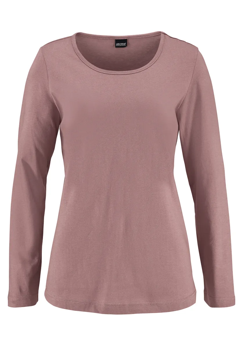 Однотонная рубашка с длинными рукавами и круглым вырезом.