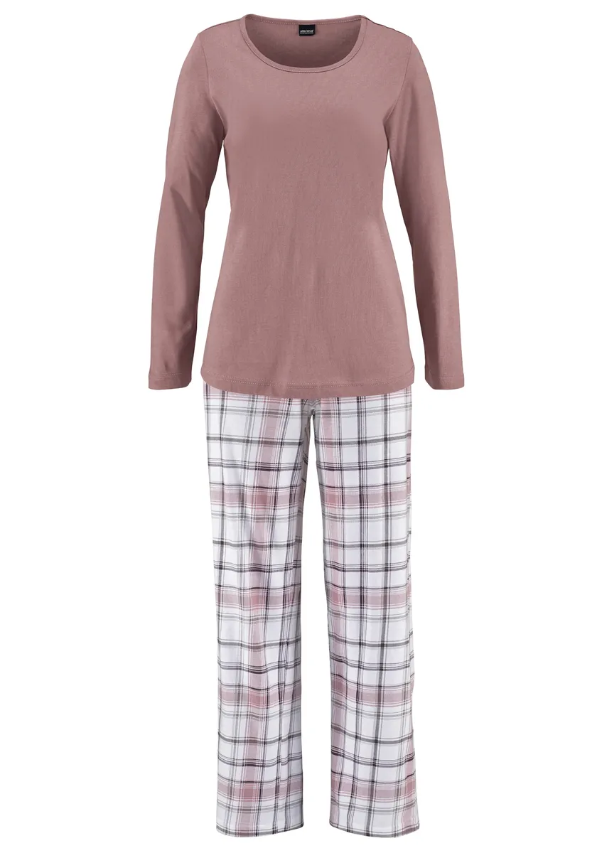 Пижама из Аризоны, верх лилового цвета, с длинными рукавами и круглым вырезом; длинные брюки в клетку с прямыми штанинами
