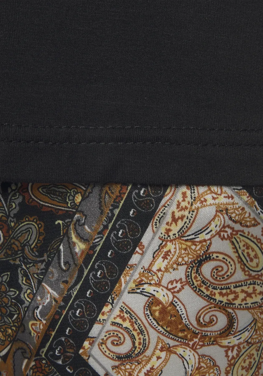 Пижама Ласкана. Однотонная рубашка со спущенными плечами и круглым вырезом. Небольшое давление на грудь. Изготовлен из удобного трикотажа. Длинные брюки с принтом по всей поверхности и эластичным поясом на кулиске. Изготовлен из элегантного атласа с эластичным наполнением.