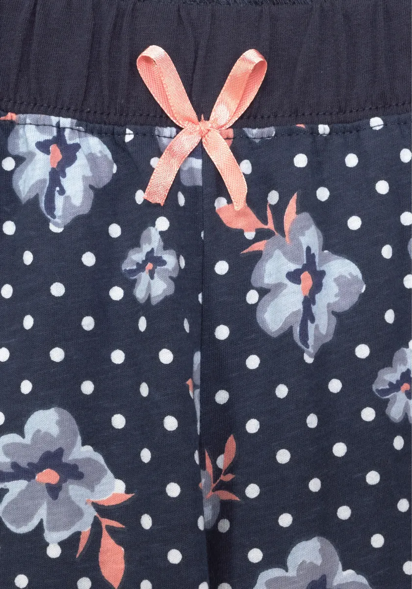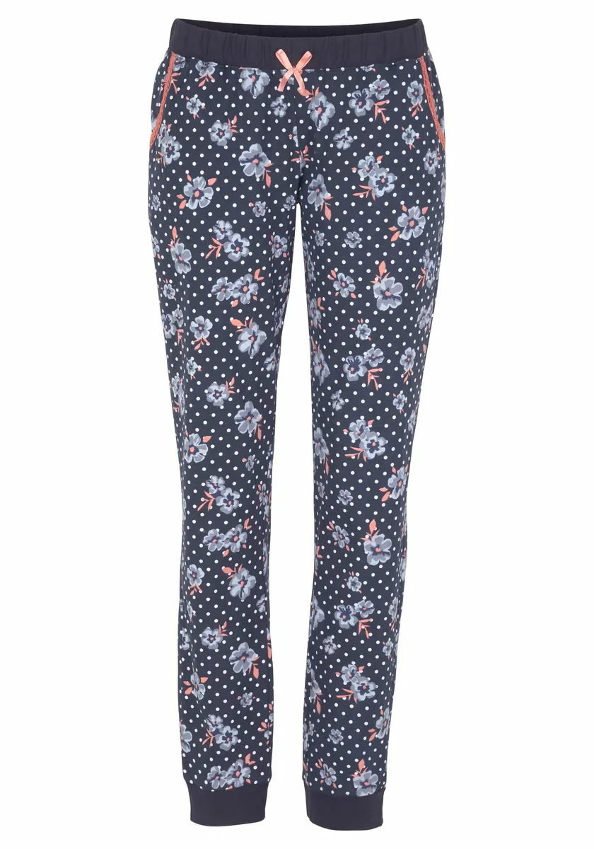 Пижама от H.I.S с кружевными деталями на закругленном V-образном вырезе, декоративной планкой на пуговицах и рукавами 3/4. Брюки с цветочным узором, эластичным поясом на кулиске и кружевной отделкой по боковым карманам. Манжеты по краям ног. Коралловый/темно-синий горошек: Изготовлен из 100% хлопка. Мятный/светло-серый горошек: Изготовлен из 90 % хлопка и 10 % полиэстера. Экрю/антрацитовый в горошек: Изготовлен из 60 % хлопка и 40 % полиэстера.