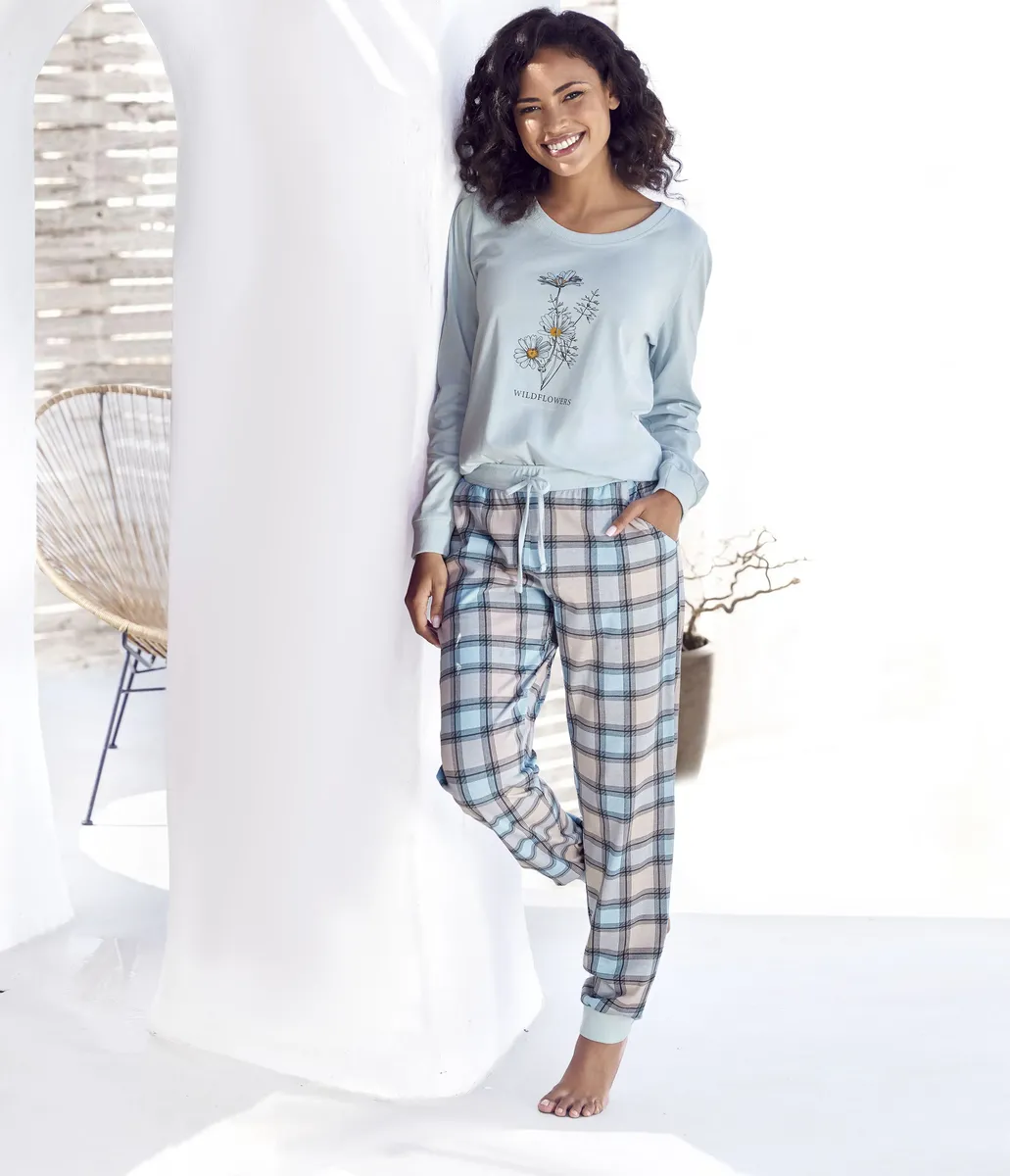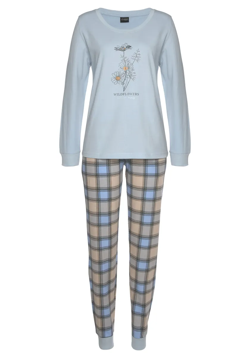 Пижама от Vivance Dreams. Рубашка с длинными рукавами, принтом спереди, круглым вырезом и манжетами на манжетах. Брюки с принтом по всей поверхности. Эластичный пояс на кулиске и ребристые манжеты на штанинах. Мягкий трикотаж высокого качества из 100% хлопка.