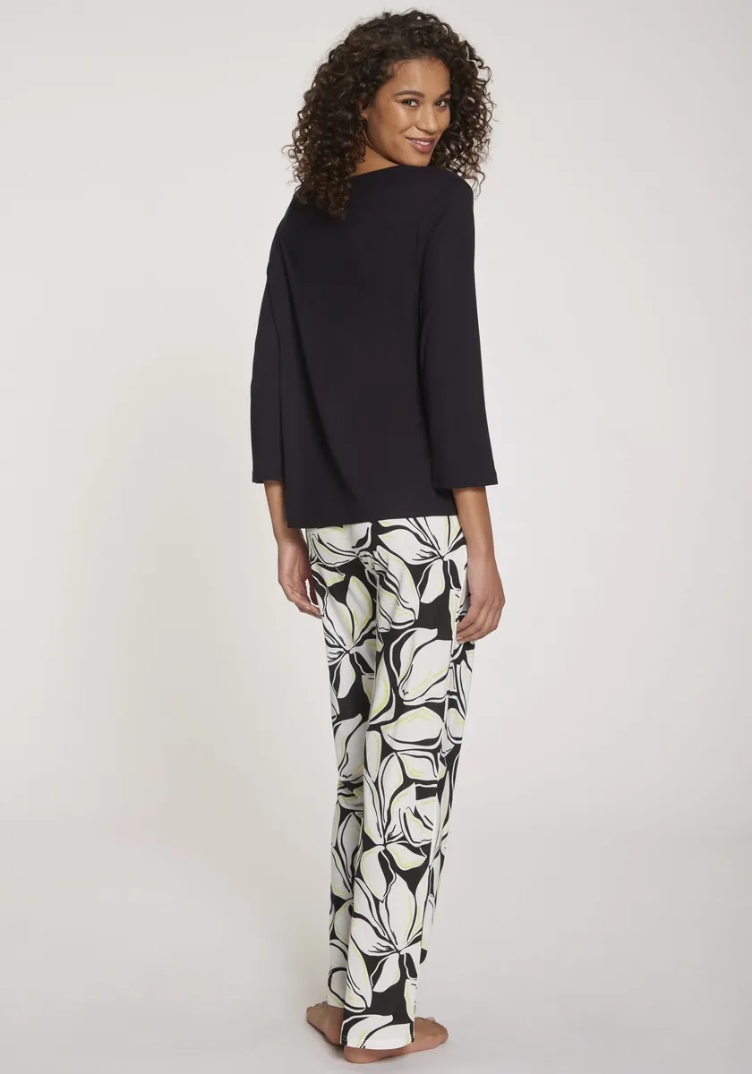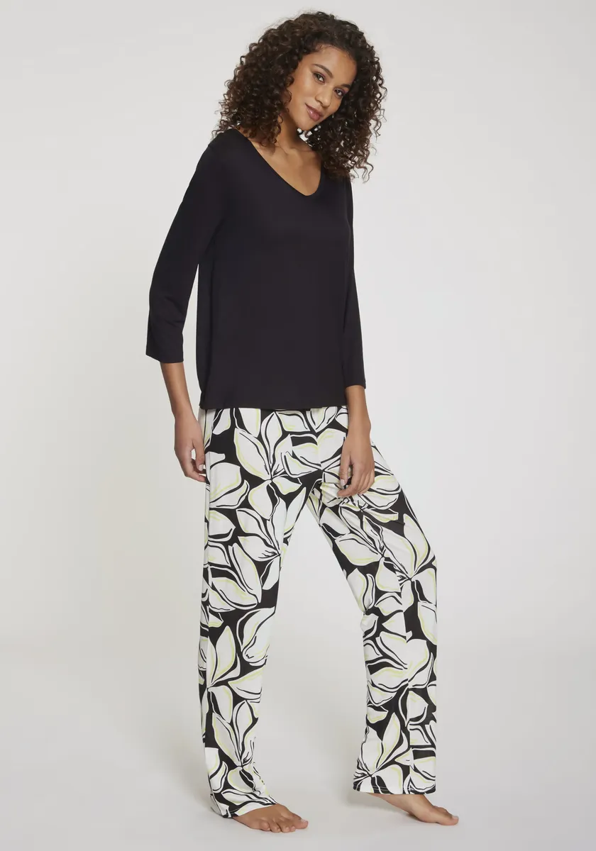 Пижама от Vivance Dreams. Цветочный принт и животный принт. Рубашка с V-образным вырезом и рукавами 3/4. Брюки с эластичным поясом. Прямой и удобный крой. Дышащая и легкая в уходе трикотажная ткань из 100% вискозы.
