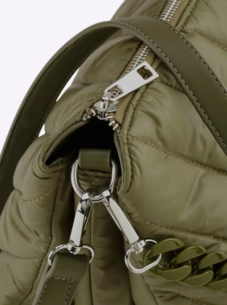 Сумка Trendy-компаньон из модной стеганой ткани с декоративными элементами серебристого цвета, ручкой-цепочкой и съемным регулируемым по длине ремнем для переноски. На молнии, 2 накладных кармана и 1 внутреннее отделение на молнии. Примерно 32x22x5 см.