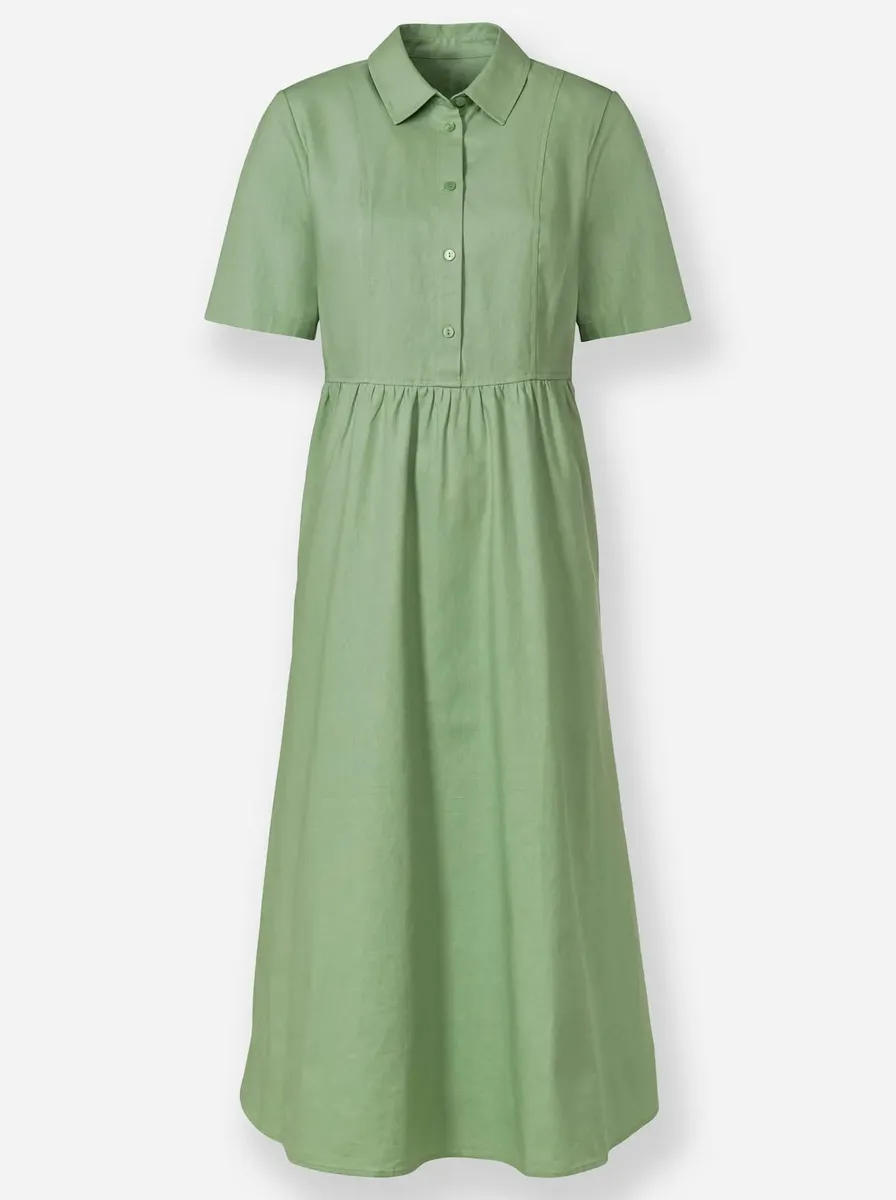 Модный цвет + повседневный крой + летнее сочетание материалов с содержанием льна: это платье — наш фаворит для жарких дней. С рубашечным воротником, планкой на пуговицах до талии и слегка расклешенной юбкой с разделительными швами спереди. Немного удлиненные рукава и потайные карманы в швах. Характерная для льна структура красива. 55% лен, 45% хлопок. Машинная стирка.