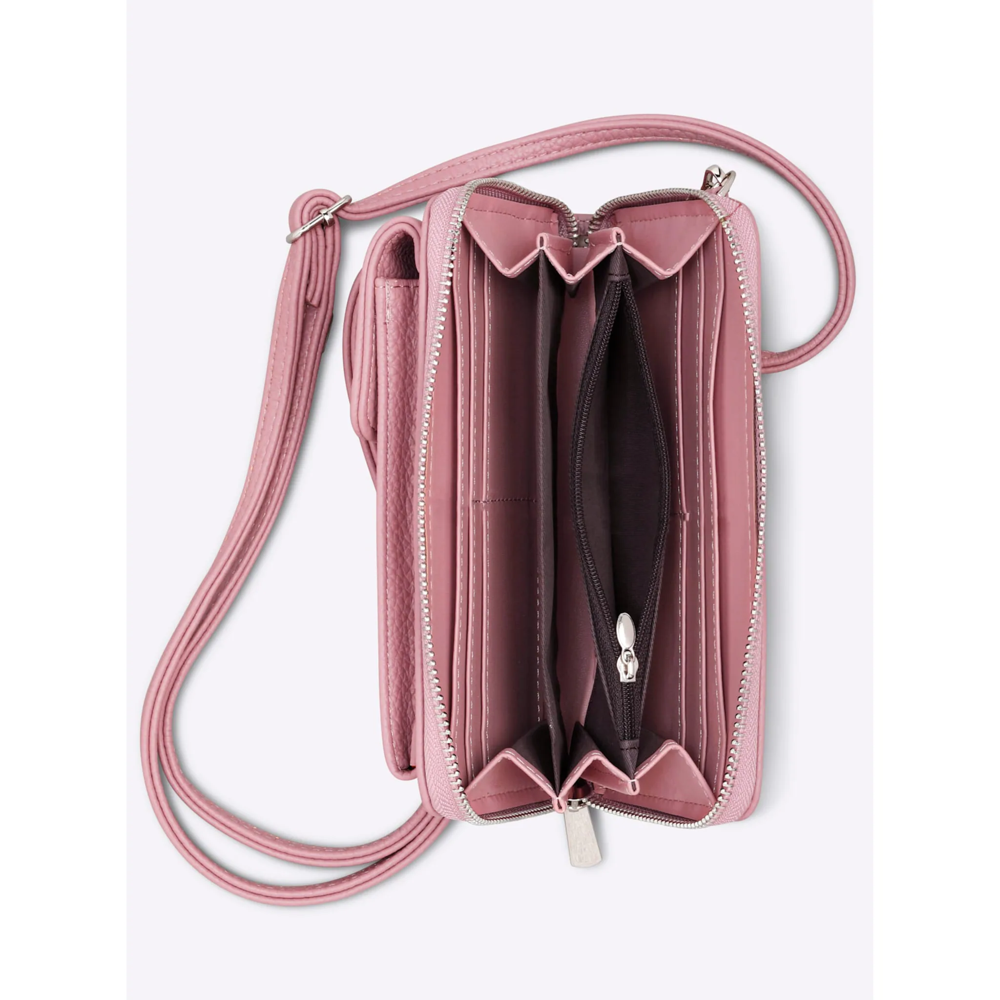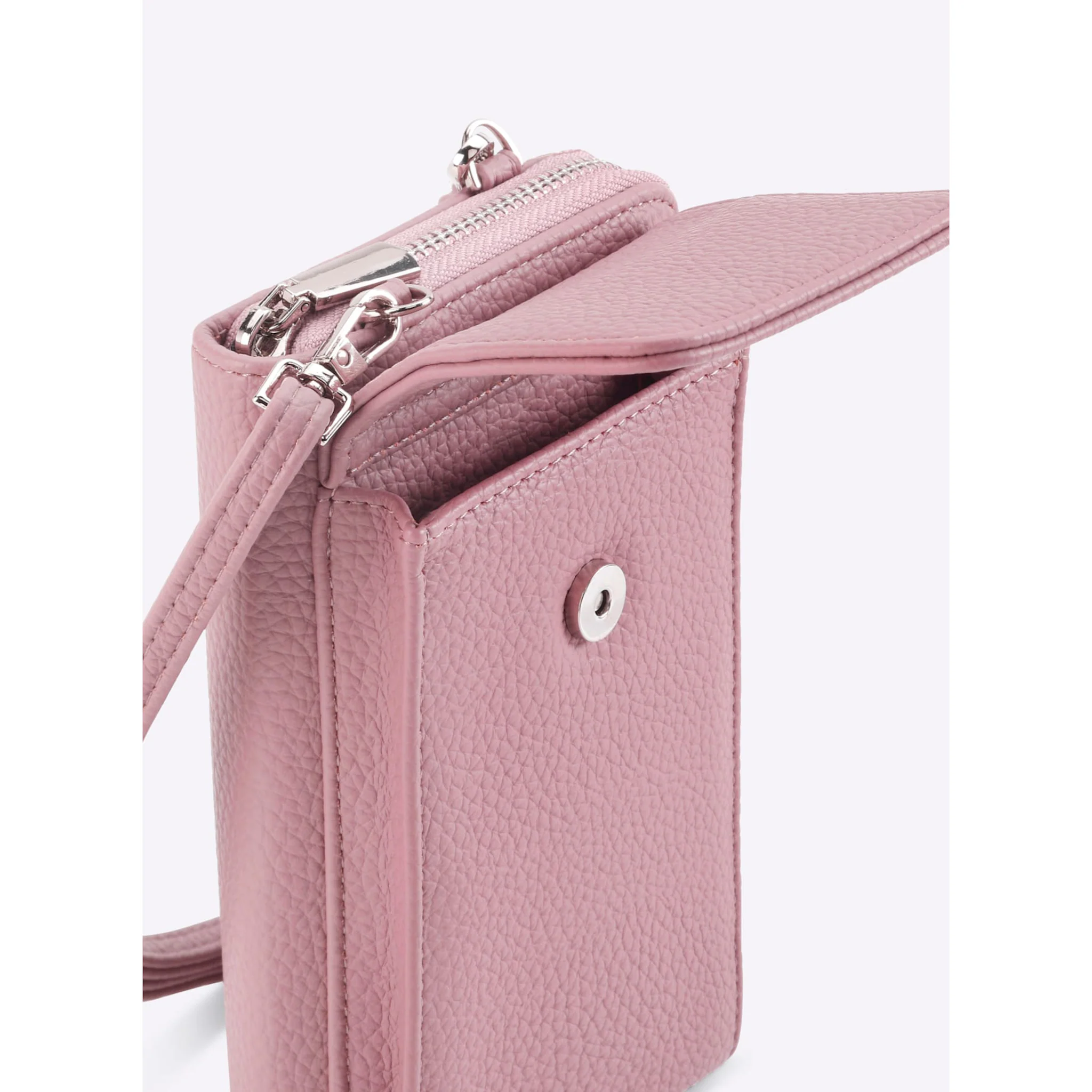 Сумка для мобильного телефона Отличный аксессуар из мягкой искусственной кожи. Идеально подходит для ключей, мобильных телефонов и кошельков. Переднее отделение для мобильного телефона на кнопке. Съемный регулируемый по длине ремень для переноски идеально подходит для ношения кроссовера. Внутренняя планировка: несколько прорезных карманов и отделение на молнии. Примерно 10,5x18,5x3 см.