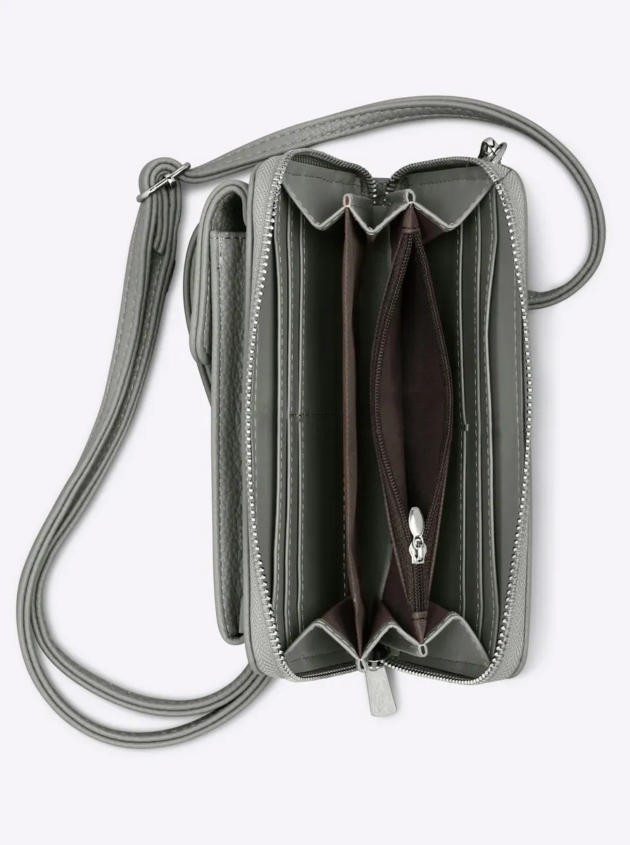Сумка для мобильного телефона Отличный аксессуар из мягкой искусственной кожи. Идеально подходит для ключей, мобильных телефонов и кошельков. Переднее отделение для мобильного телефона на кнопке. Съемный регулируемый по длине ремень для переноски идеально подходит для ношения кроссовера. Внутренняя планировка: несколько прорезных карманов и отделение на молнии. Примерно 10,5x18,5x3 см.