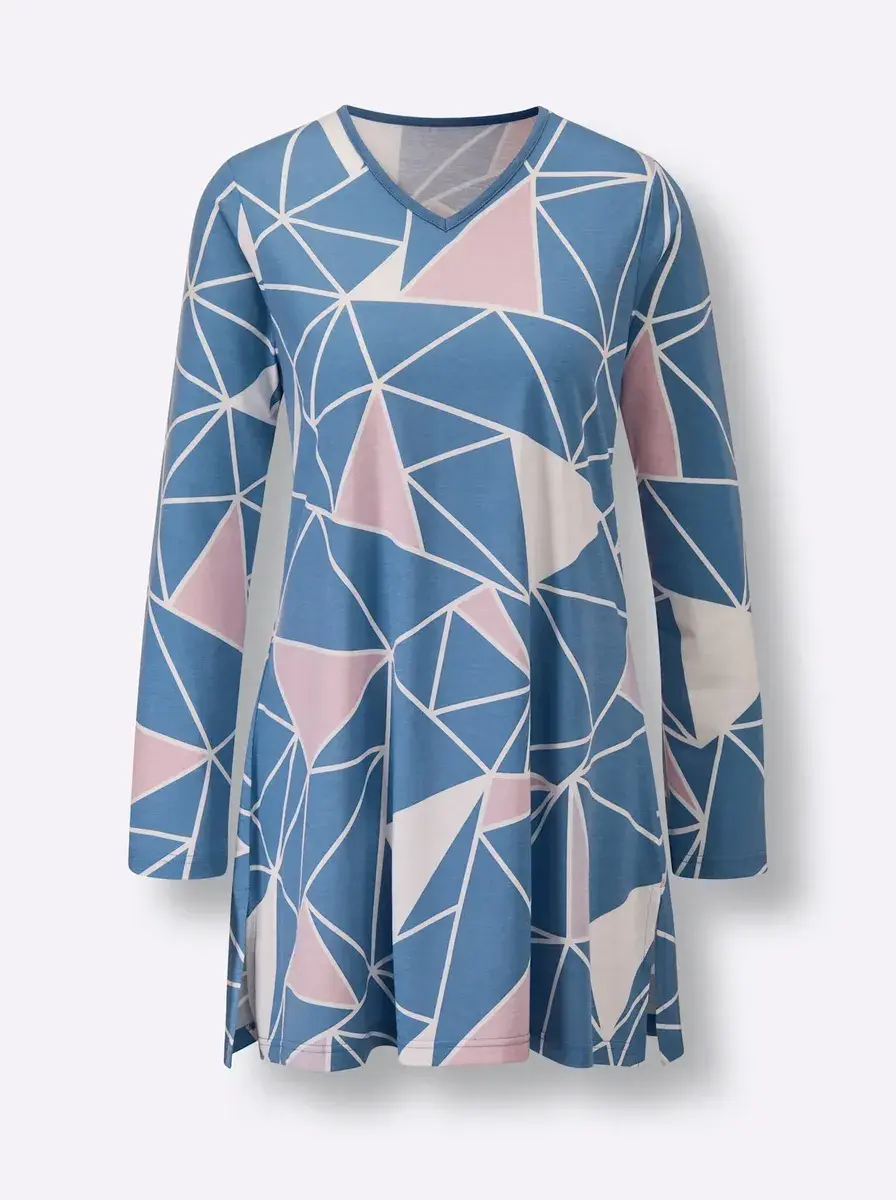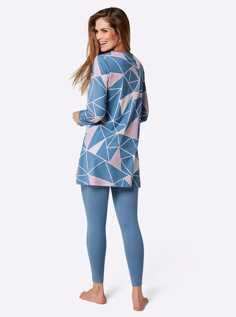 Пижама с ультрасовременным графическим дизайном для ультрасовременного образа! Текущая форма туники. Однотонные леггинсы с эластичным поясом. Одинарный трикотаж. 50% хлопок, 50% вискоза. Низ: 48% хлопок, 48% вискоза, 4% эластан.