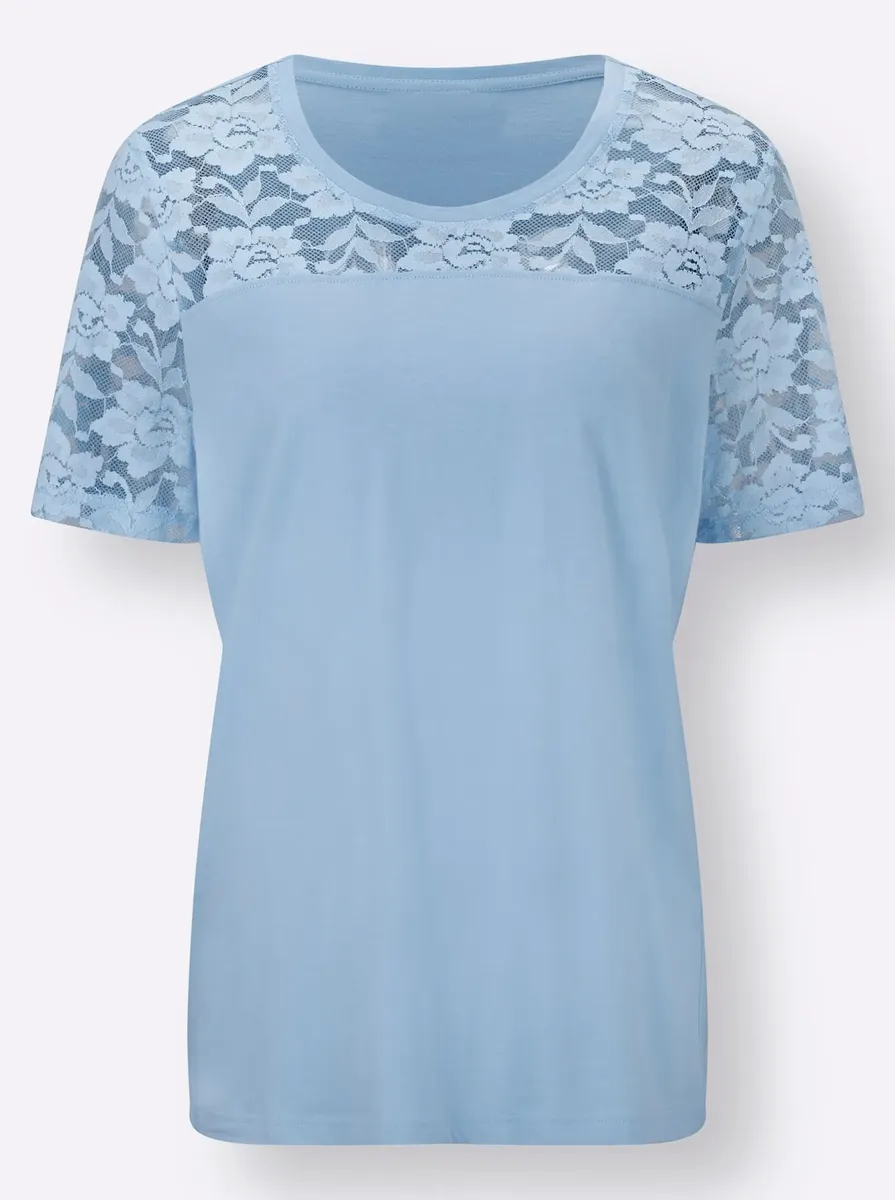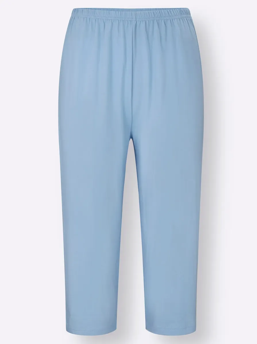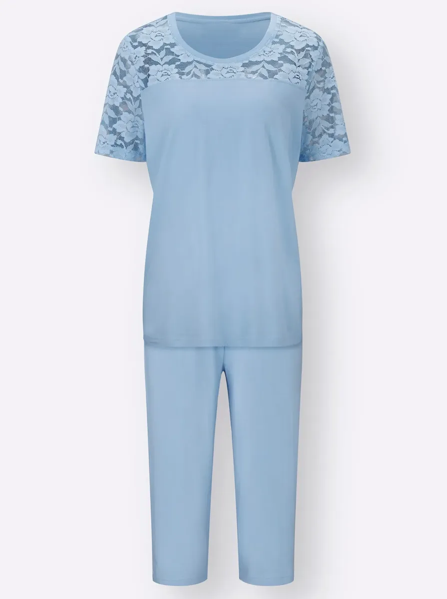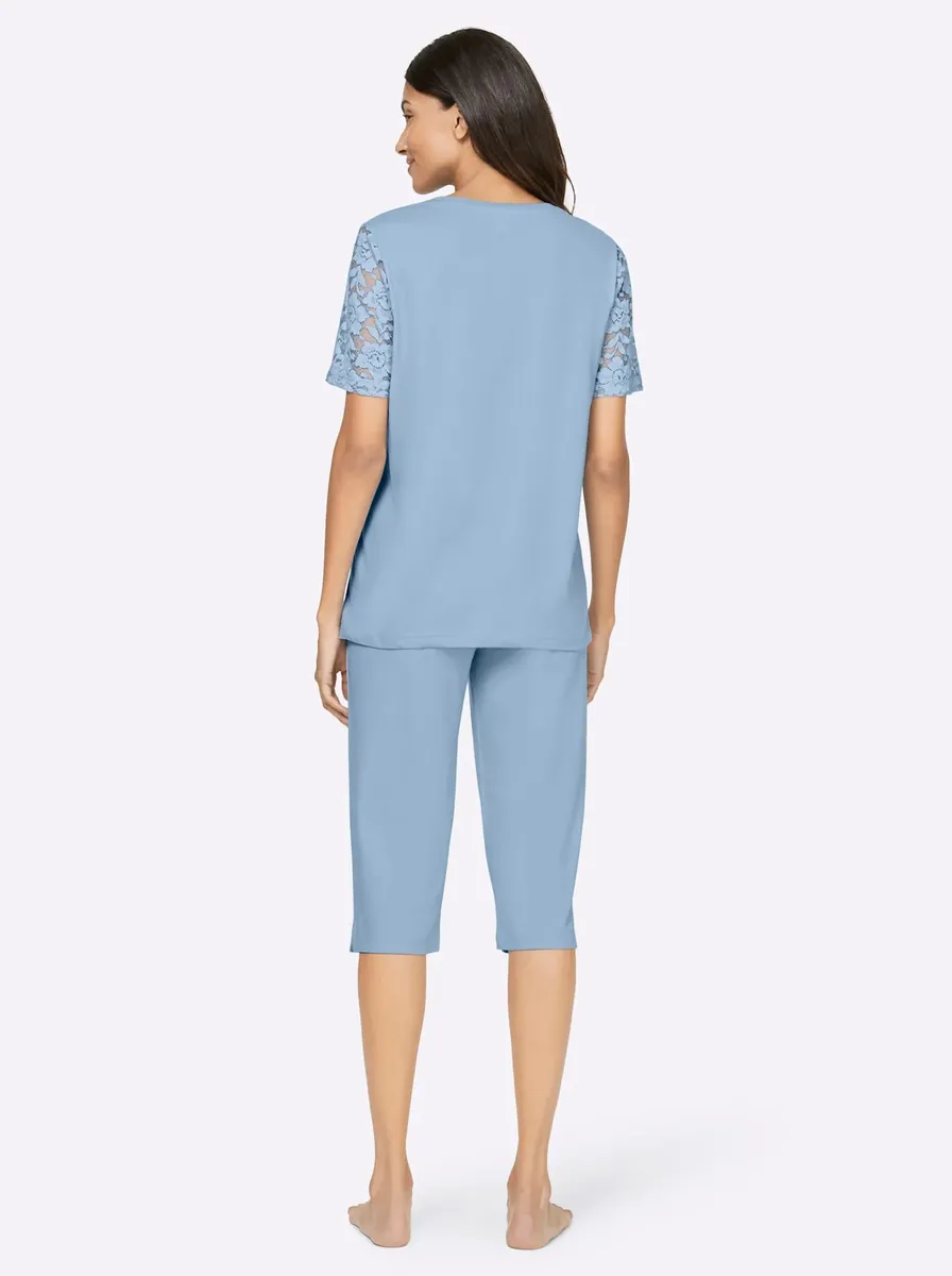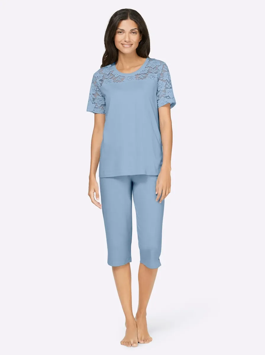 Пижама-капри с изящными кружевными деталями на кокетке и рукавах. Брюки с эластичным поясом и разрезами для ног. Одинарный трикотаж. 100% хлопок. Кружево: 80% хлопок, 20% полиамид.
