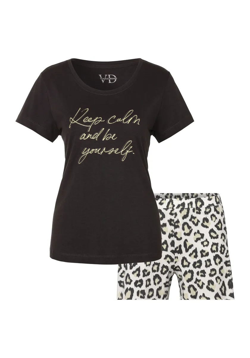 Пижамный комплект Vivance Dreams из трех предметов. С принтом Льва. Рубашка с короткими рукавами, круглым вырезом и принтом спереди. Длинные брюки с принтом по всей поверхности и короткие шорты с эластичным поясом и боковыми карманами. Мягкий трикотаж высокого качества из мягкой смеси хлопка.
