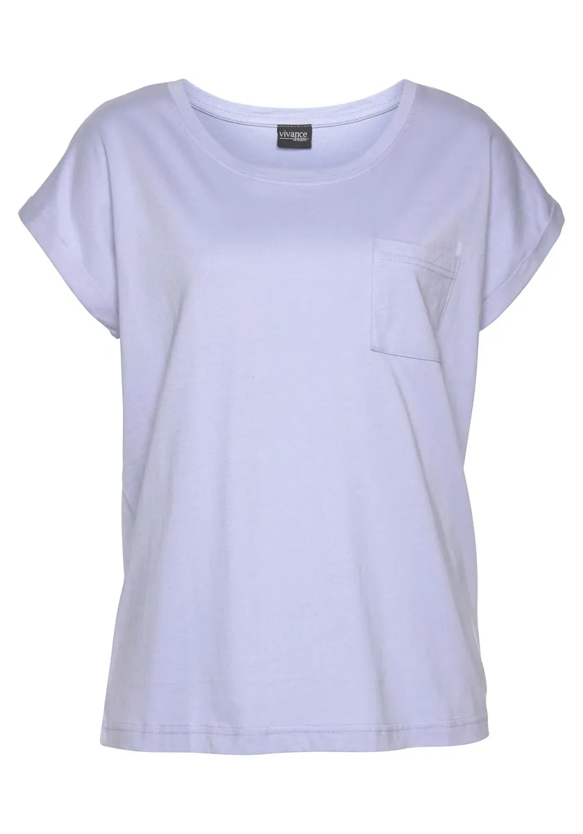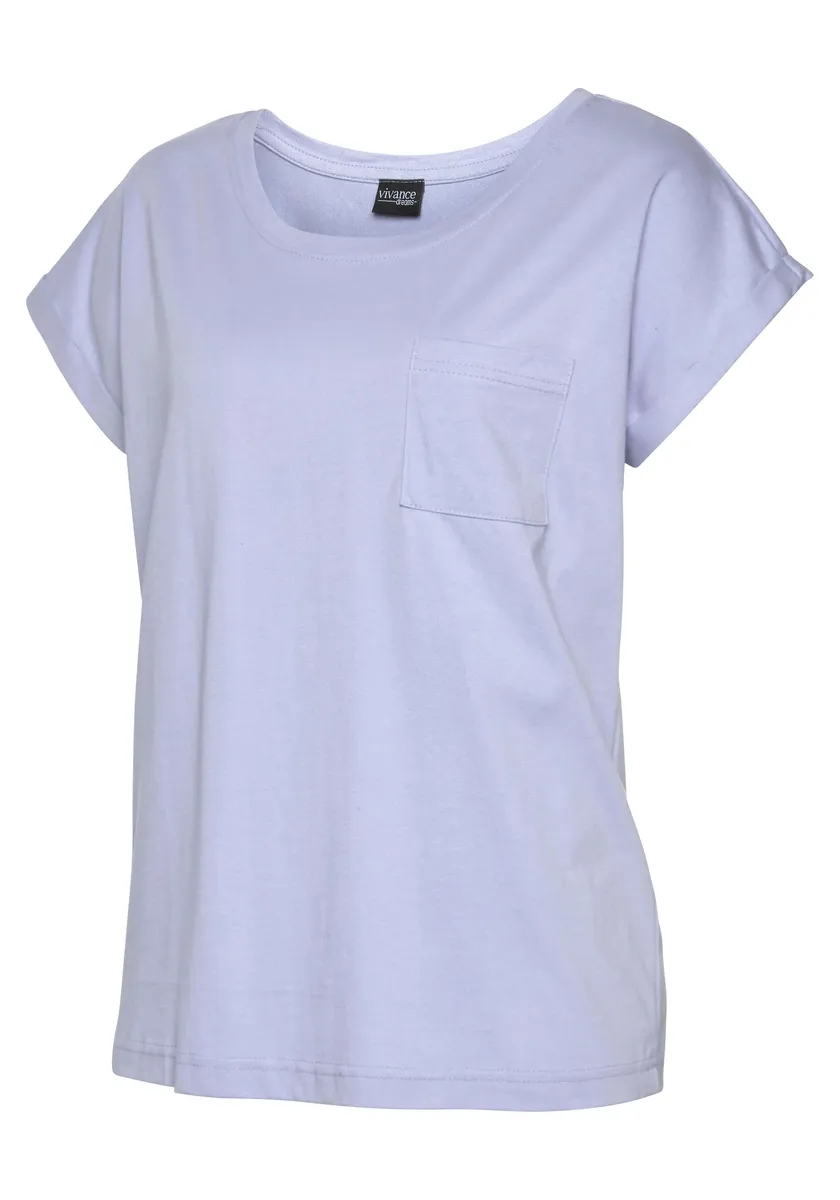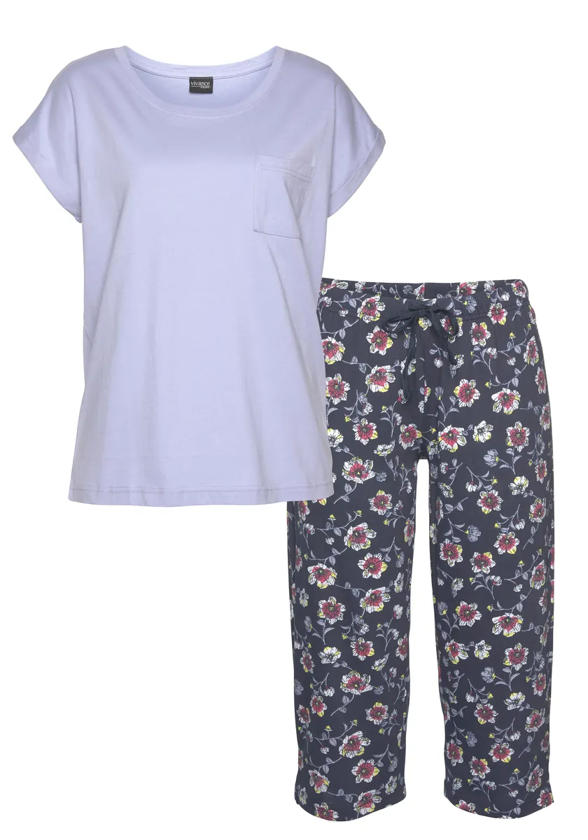 Пижамы-капри Vivance Dreams с графическим принтом. Однотонная рубашка с короткими рукавами, отрезными рукавами, круглым вырезом и накладным нагрудным карманом. Капри с принтом по всей поверхности и эластичным поясом на кулиске. Внешний материал: 100% хлопок (поддерживает хлопок, произведенный в Африке).