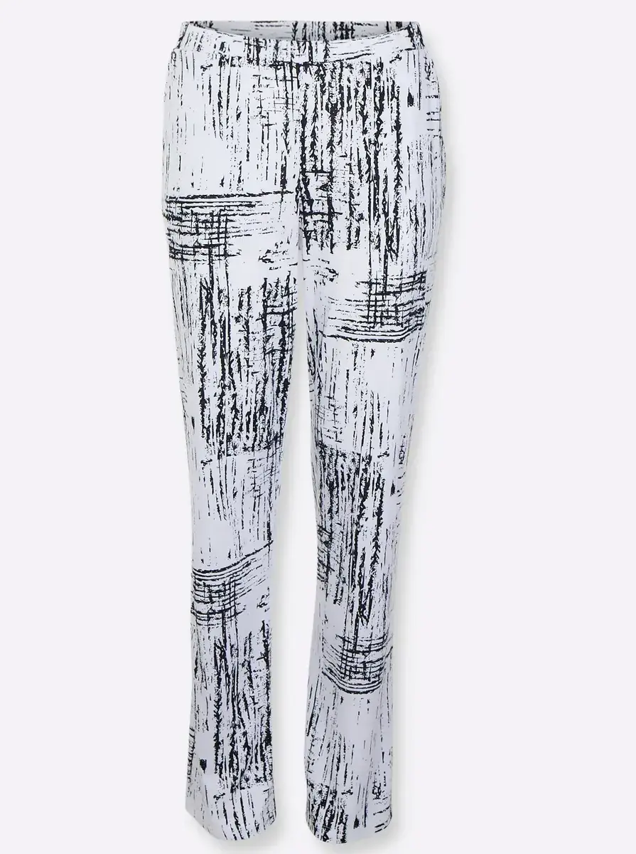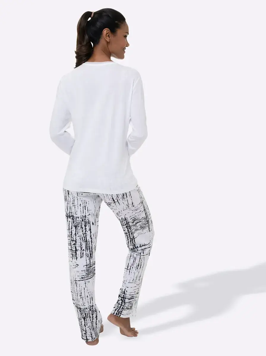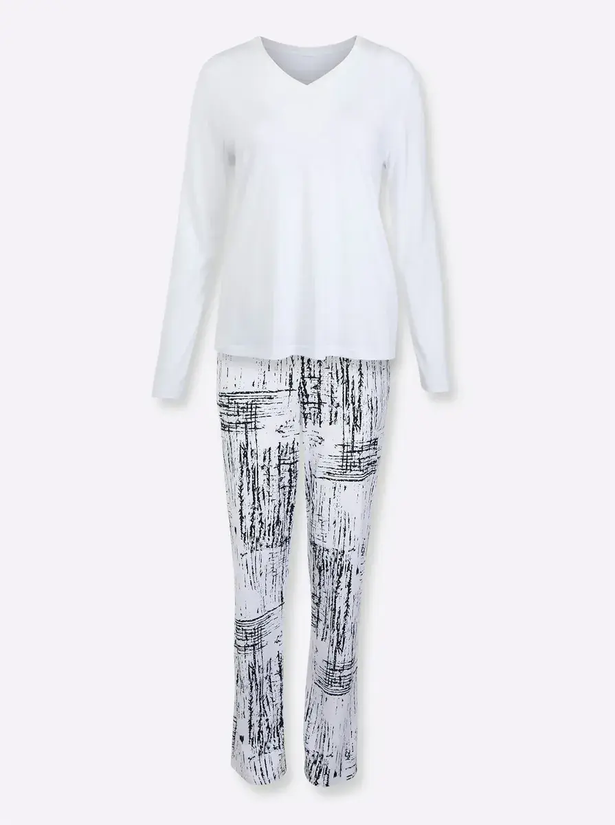 Пикап в отличном дизайне! Пижамы из прачечной. Однотонный топ с V-образным вырезом. Брюки с принтом невероятно удобны благодаря эластичному поясу. С 2 боковыми карманами. Модель из невероятно мягкого трикотажа. 50% хлопок, 50% модал.