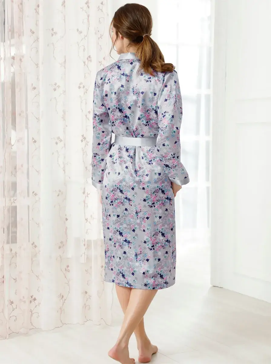 Элегантная цветочная мечта... халат из тонкого блестящего атласа. Только мягкий хлопок с начесом приятен коже! Отделка горловины, манжет и пояса контрастные, одного цвета. 85% полиэстер, 15% хлопок.