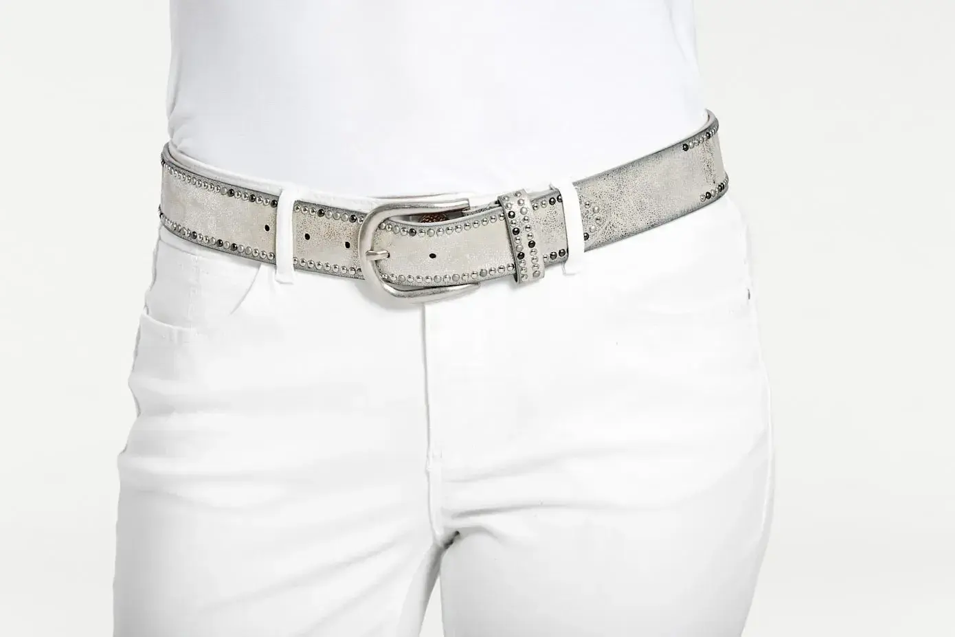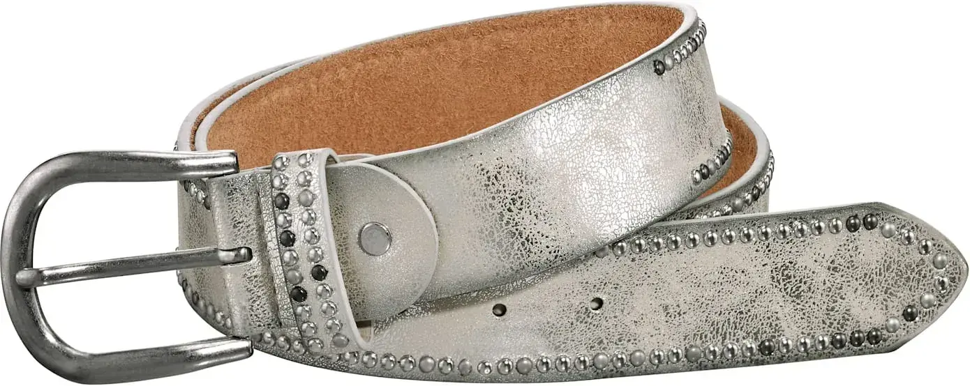 Ремень в модном металлизированном исполнении с небольшими заклепками по краю. Изготовлен из высококачественного воловьего спилка и синтетики. Закругленная металлическая застежка. Ширина ок. 3,5 см.