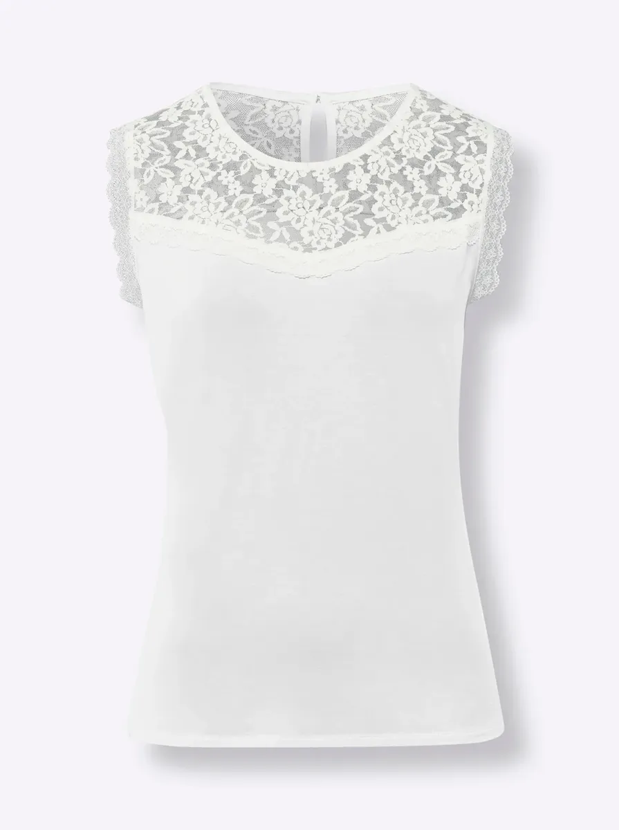 Элегантный базовый топ-рубашка из мягкой смеси вискозы и эластана с прозрачным эластичным кружевом спереди и сзади. Вырез круглый, застегивается на пуговицу и разрез. 95% вискоза, 5% эластан. Машинная стирка.