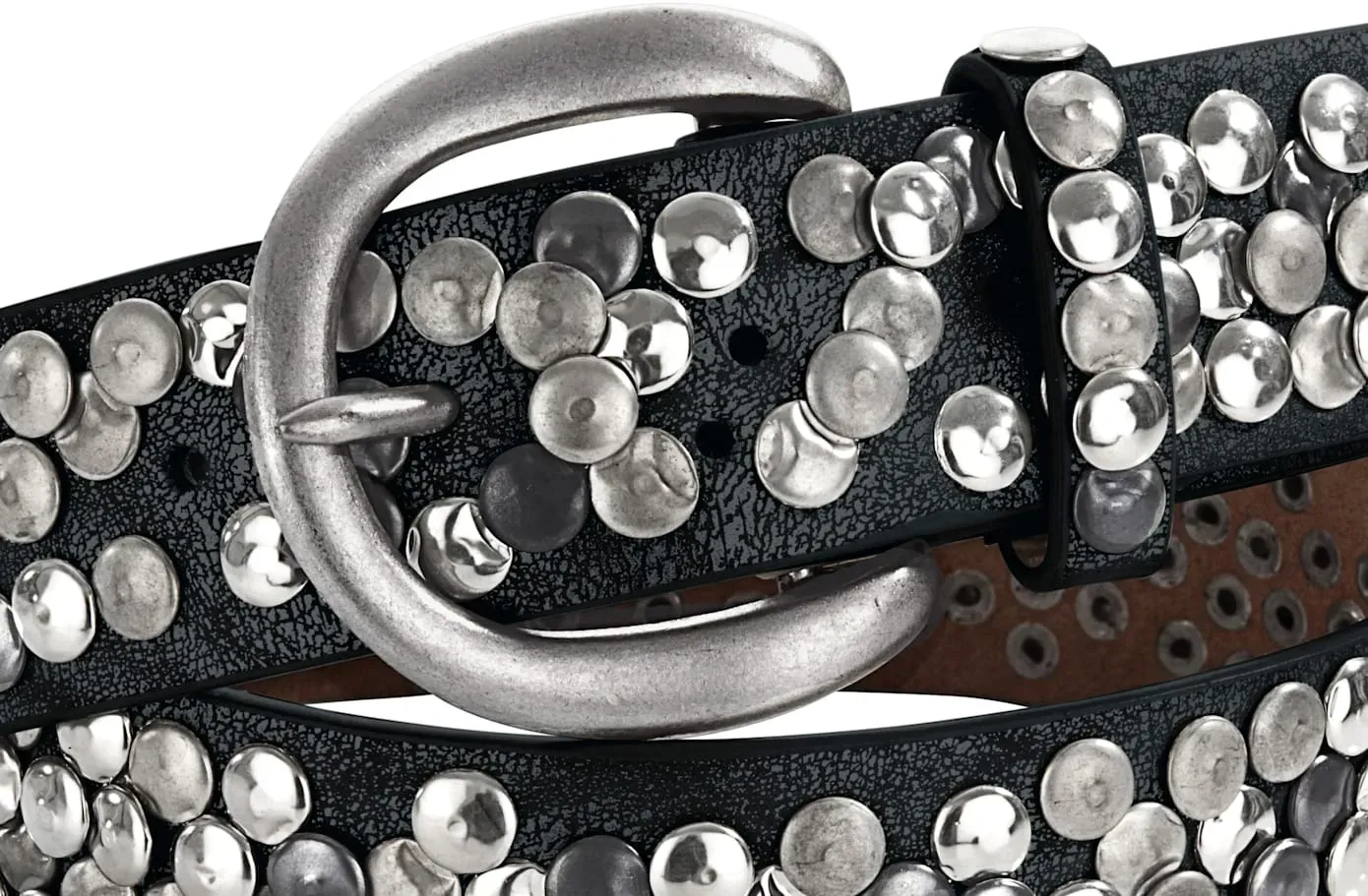 Ремень по всей поверхности с коваными заклепками. Изготовлен из высококачественного спилка яловой кожи и синтетического материала, с закругленной металлической застежкой. Ширина ок. 4 см.