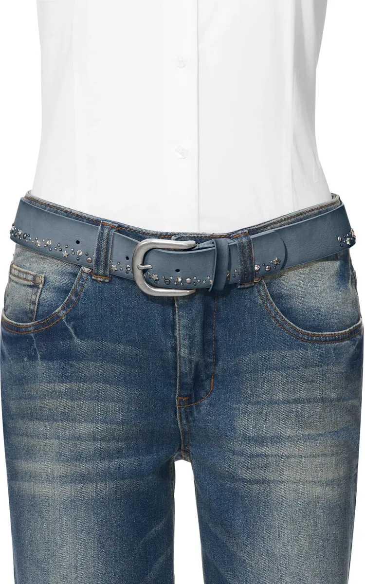 Ремень простой формы. Смесь коровьего спилка и синтетики с модной отделкой. С заклепками разного размера, акриловыми камнями и закругленной металлической застежкой. Ширина ок. 3,5 см.