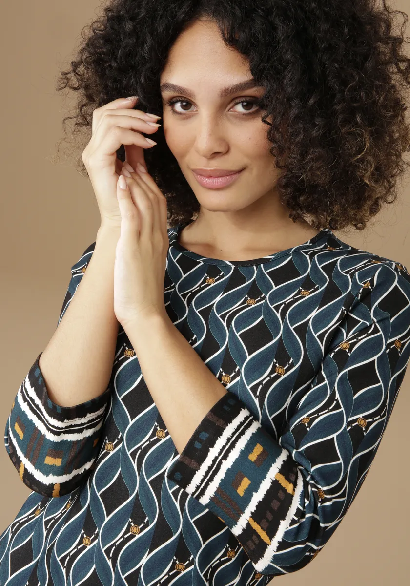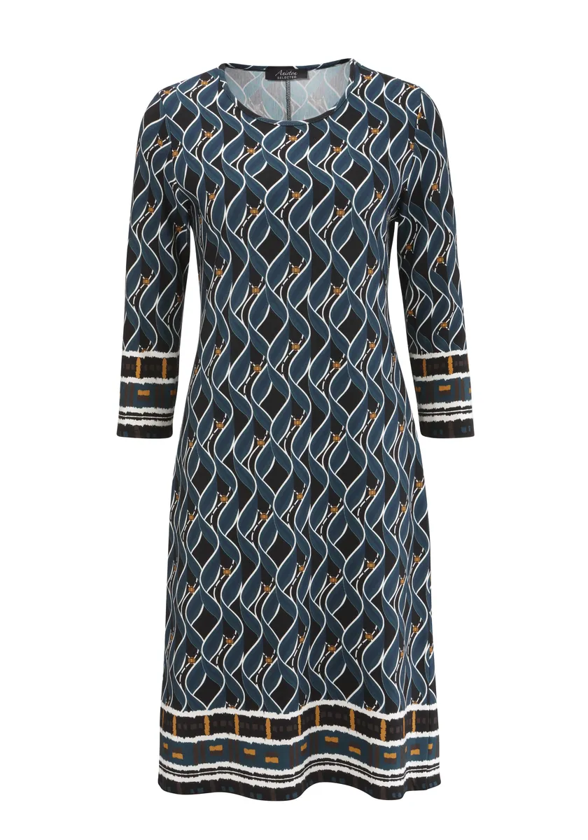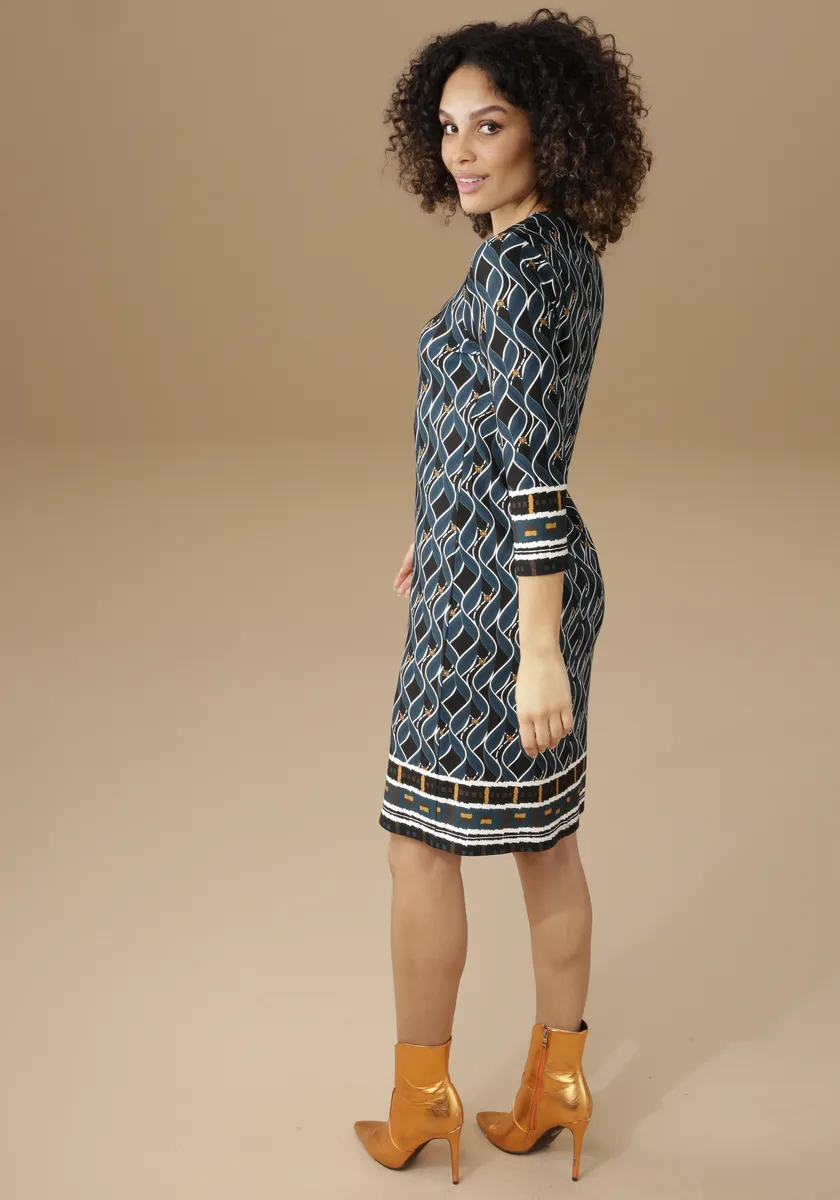 Ретро-платье от Aniston Selected. С рисунком по краям. Круглый вырез горловины и рукава длиной 3/4. Мягкое качество Milano Rib: можно надевать и чувствовать себя хорошо! Тонкая талия. Платье идеально облегает фигуру и имеет длину до колен. Длина в 36 размере около 92см. Машинная стирка.