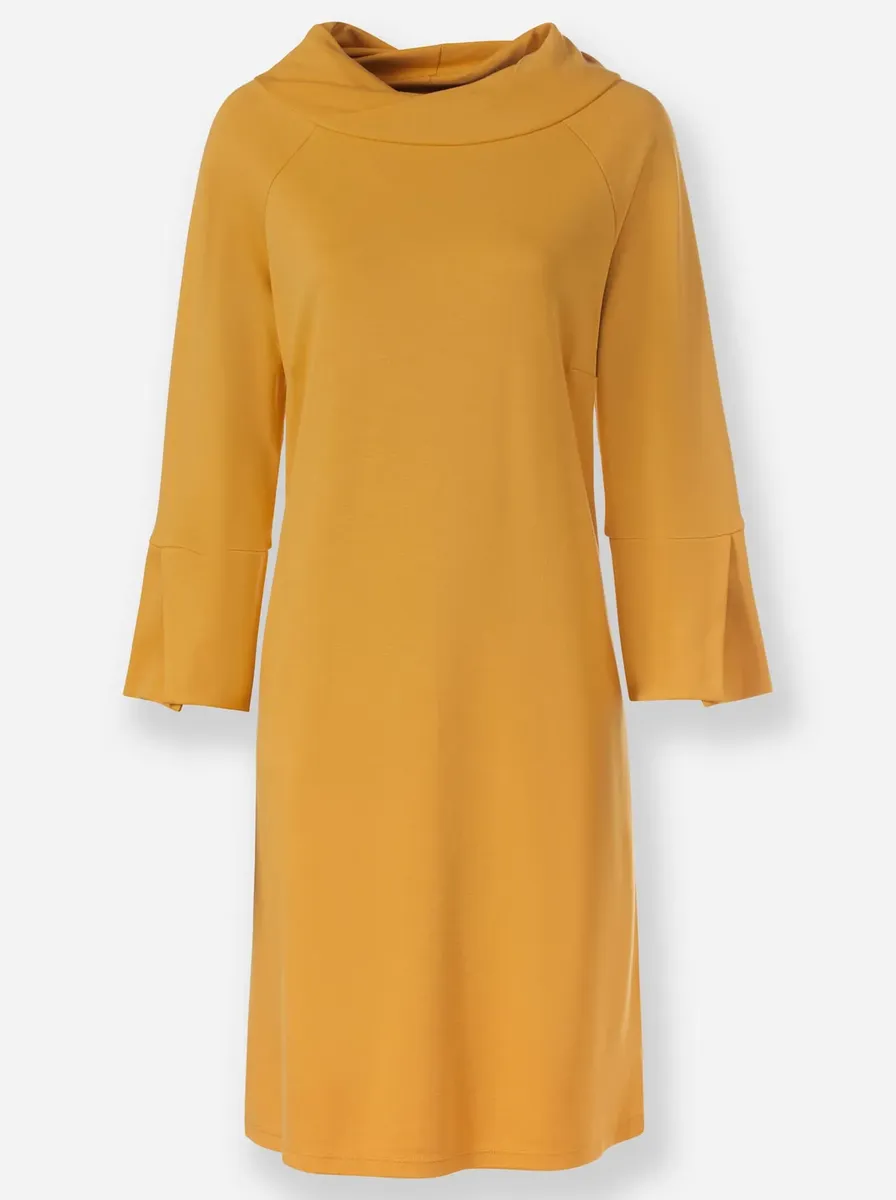 Платье из джерси отличного чемоданного качества. С мягко ниспадающим широким воротником-стойкой и рукавами 3/4. Карманы в боковых швах. 70% вискоза, 5% эластан, 25% полиамид. Машинная стирка.