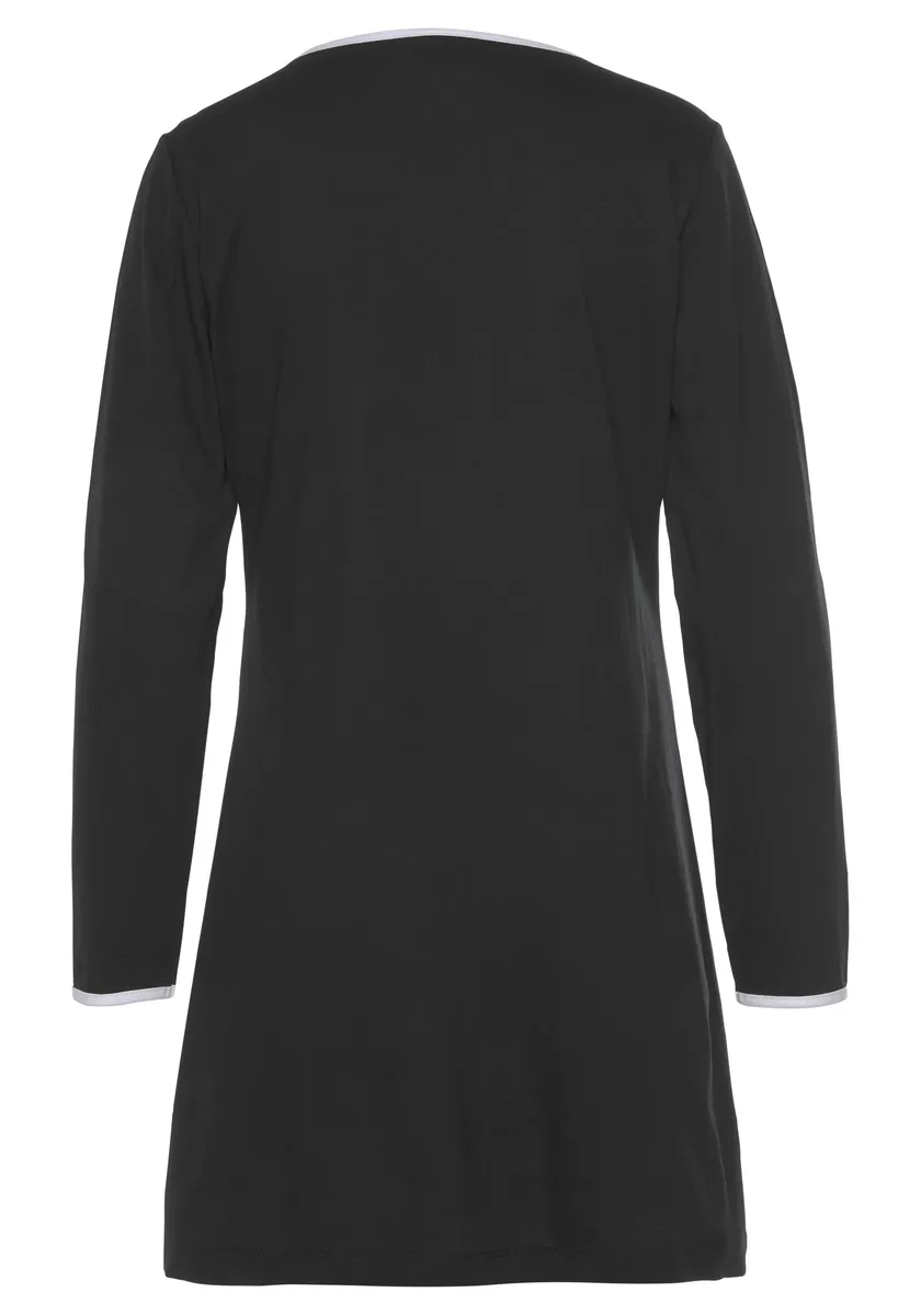 Ночная рубашка арахисового цвета. С крупным принтом спереди. Контрастные полосы на круглом вырезе и длинных рукавах. Комфортное качество. изготовлен из 100% хлопка.