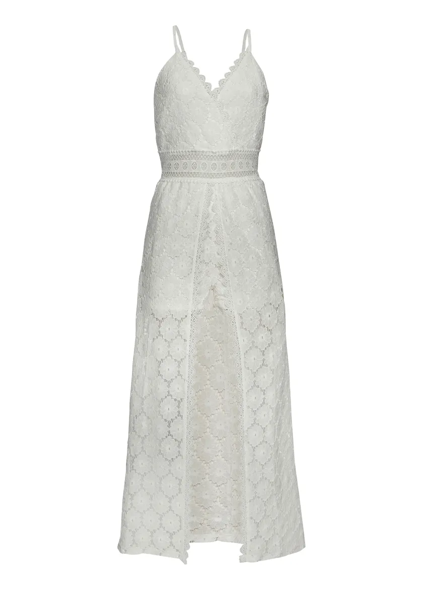 Платье из цветочного кружева от Vivance. Глубокий V-образный вырез с запахом. Регулируемые бретели-спагетти. Талия с контрастной кружевной вставкой. Деталь прыжковой юбки макси-длины со встроенными шортами. Облегает фигуру. Качество, простое в уходе.