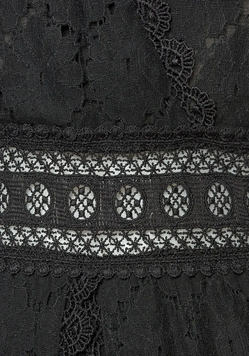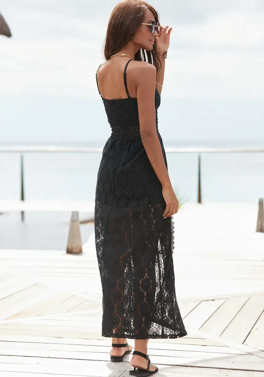 Платье из цветочного кружева от Vivance. Глубокий V-образный вырез с запахом. Регулируемые бретели-спагетти. Талия с контрастной кружевной вставкой. Деталь прыжковой юбки макси-длины со встроенными шортами. Облегает фигуру. Качество, простое в уходе.