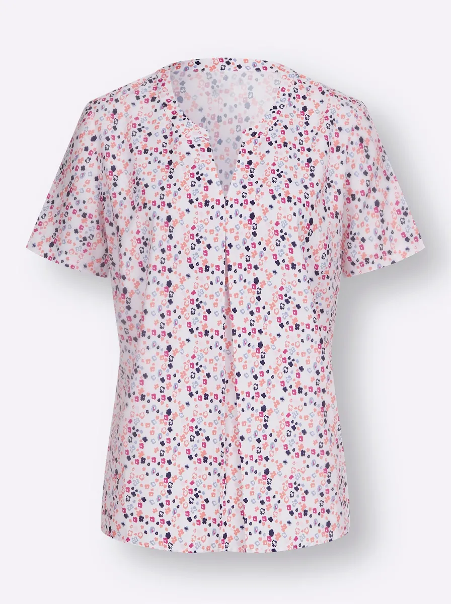 Эта блузка без шнуровки впечатляет своей ценой и качеством! В модном узоре. Вырез круглый, с небольшой V-образной складкой. 100% полиэстер. Машинная стирка.