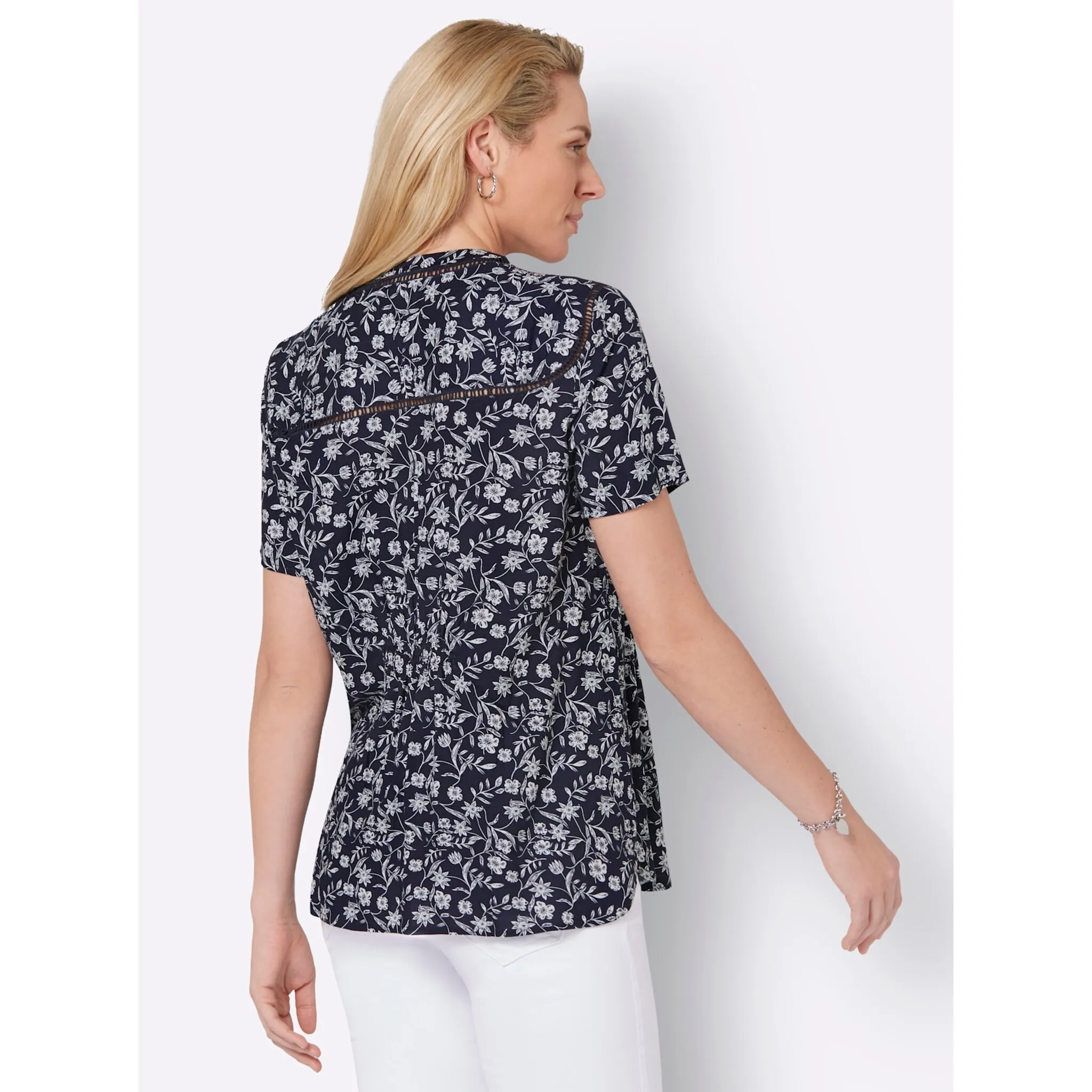 Эта блузка с принтом облегающего фигуру силуэта поражает множеством привлекательных деталей: изящным кружевом-лесенкой по круглому вырезу с открытым V-образным вырезом, по переднему плечевому шву и на кокетке сзади. Сборка сзади и оборки на разделительном шве выгодно подчеркивают талию. Планка на пуговицах во всю длину и боковые разрезы на подоле. 100% вискоза (ECOVERO). Машинная стирка.