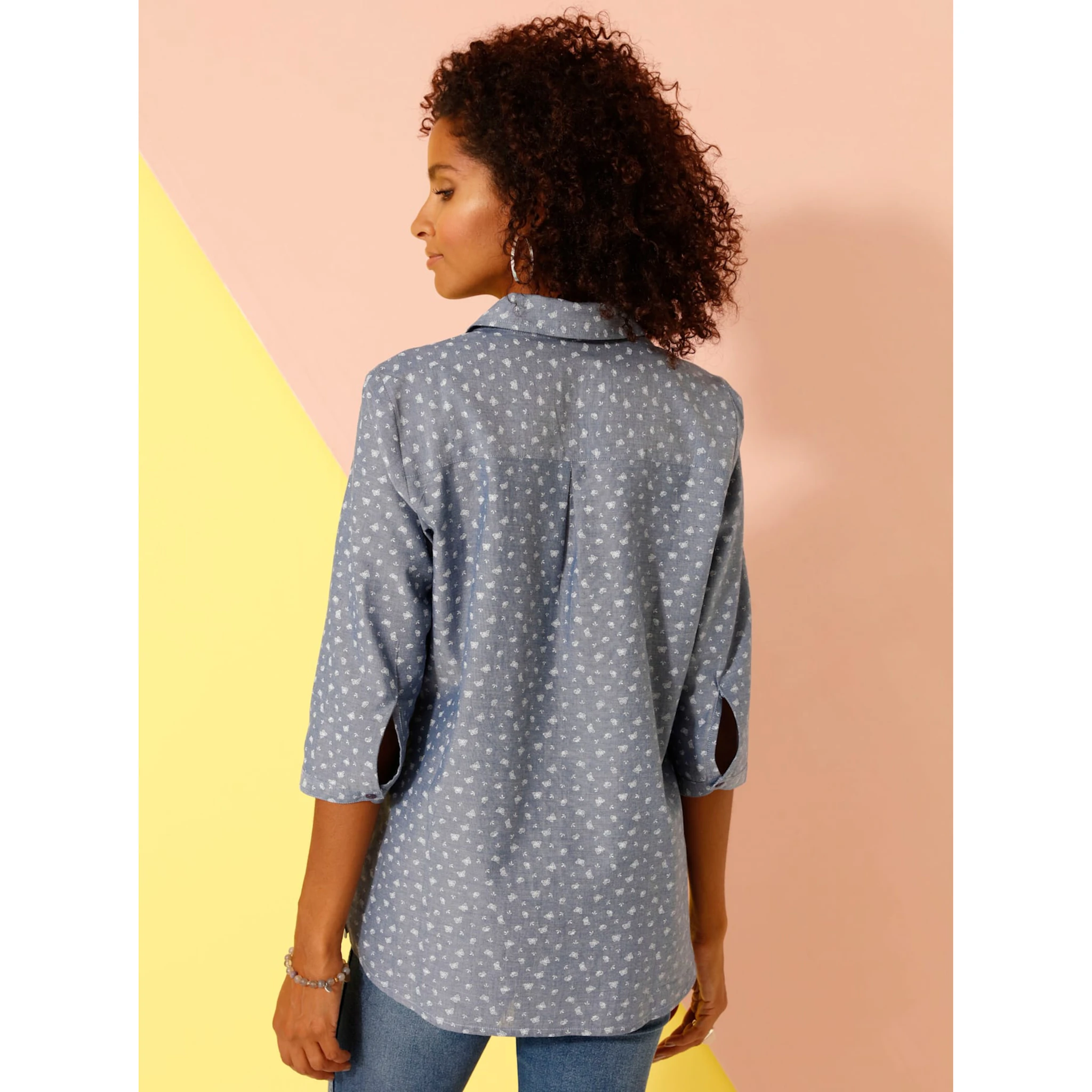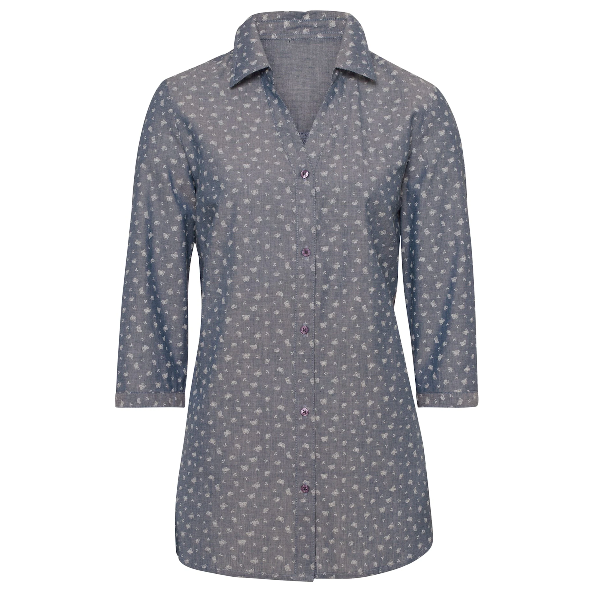 Эта блузка умело сочетает в себе модный джинсовый образ с игривым узором в виде бабочек. С открытым воротником рубашки, рукавами 3/4 с манжетами на пуговицах и слегка закругленным низом. 100% хлопок. Машинная стирка.