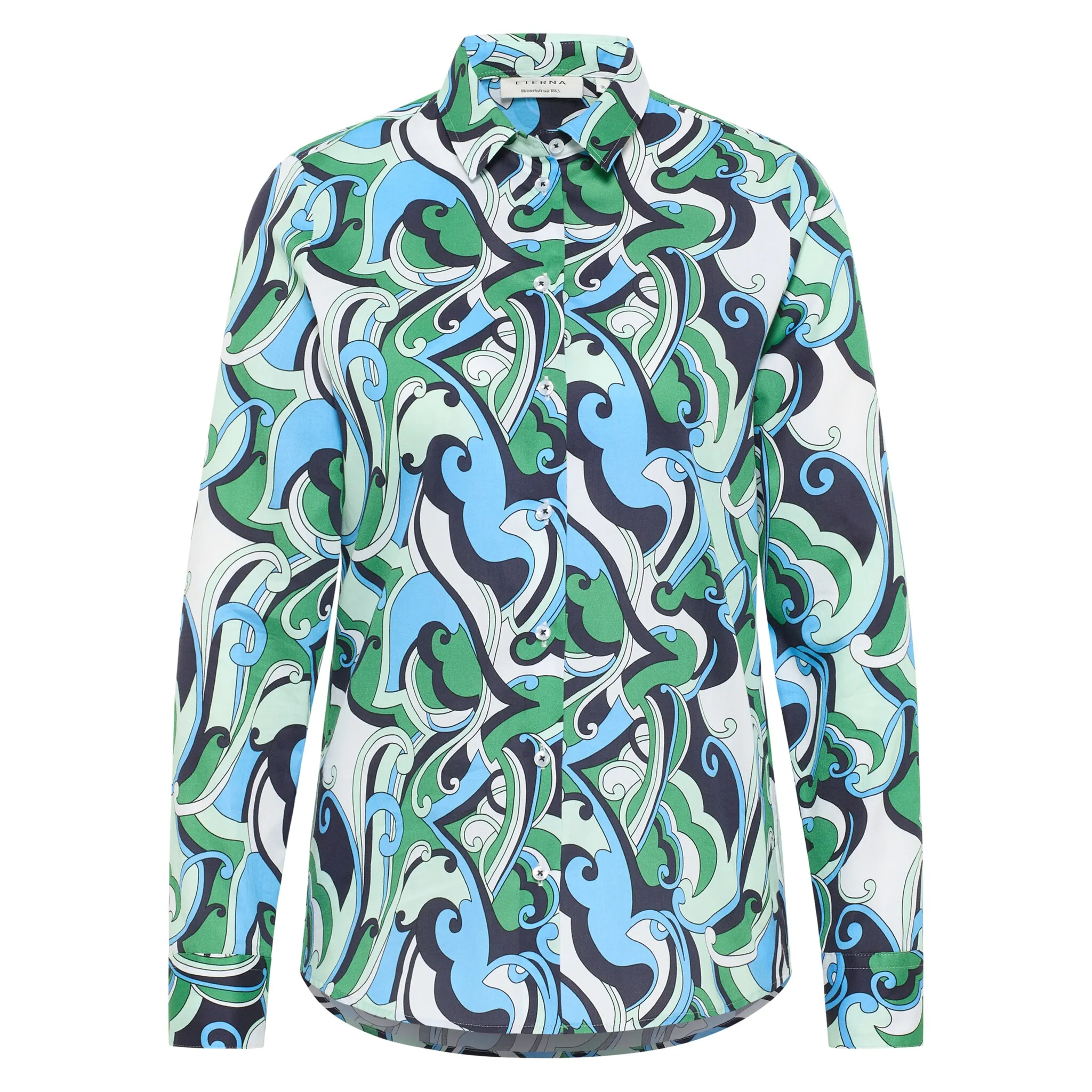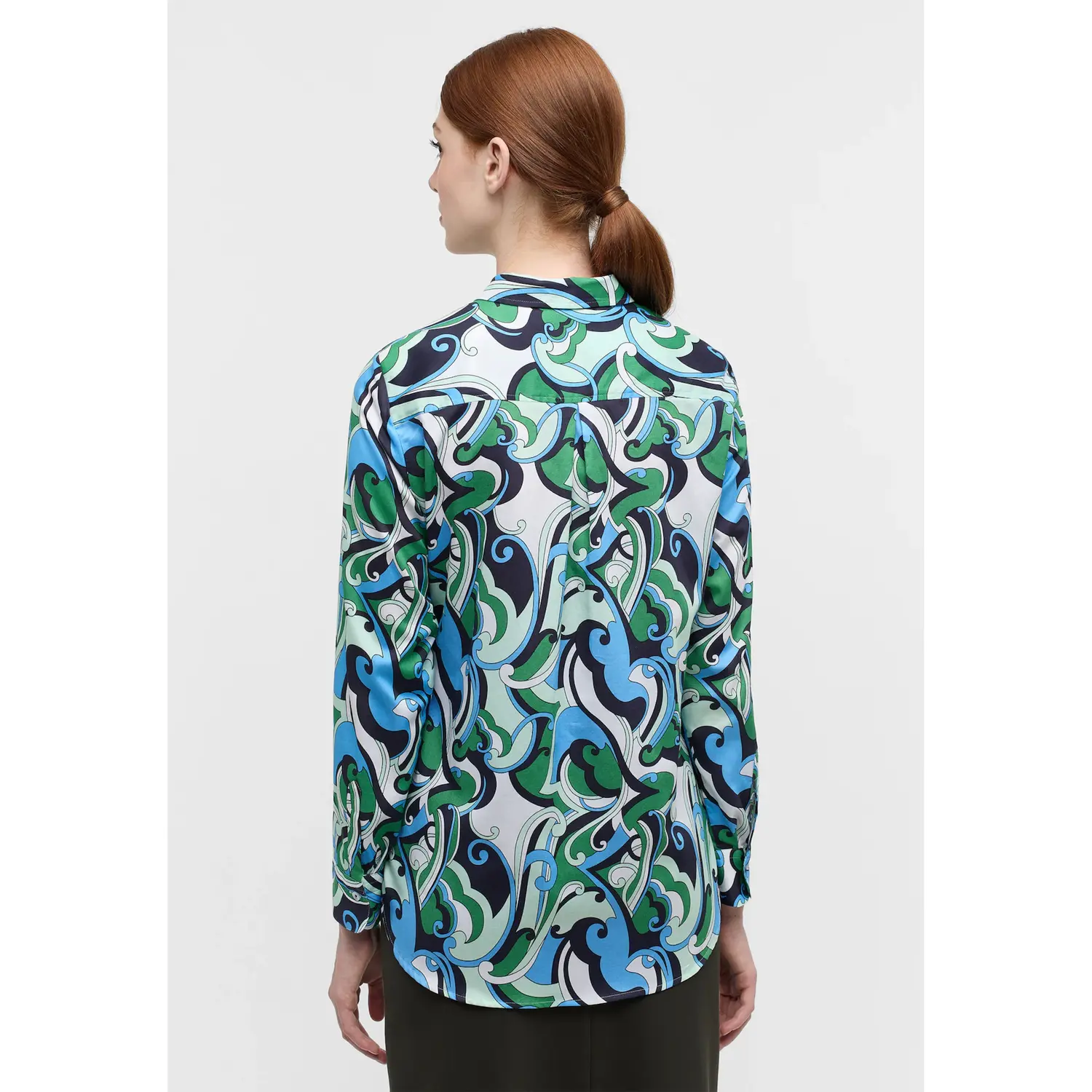 Эта блузка, выполненная из атласной ткани с ярким принтом, универсальна, удобна и выглядит модно. Чистый хлопок поражает тонким блеском и мягкостью. Длина по спинке 72 см, низ закруглен. Воротник рубашки подчеркивает женственный, классический характер.  Блузка-рубашка REGULAR FIT прямого кроя сидит на любой фигуре. Модель слегка подогнана по боковому шву. Складка на кокетке сзади обеспечивает повседневную ширину. Сделайте заказ онлайн сегодня, потому что с этой блузкой вы будете привлекать внимание.