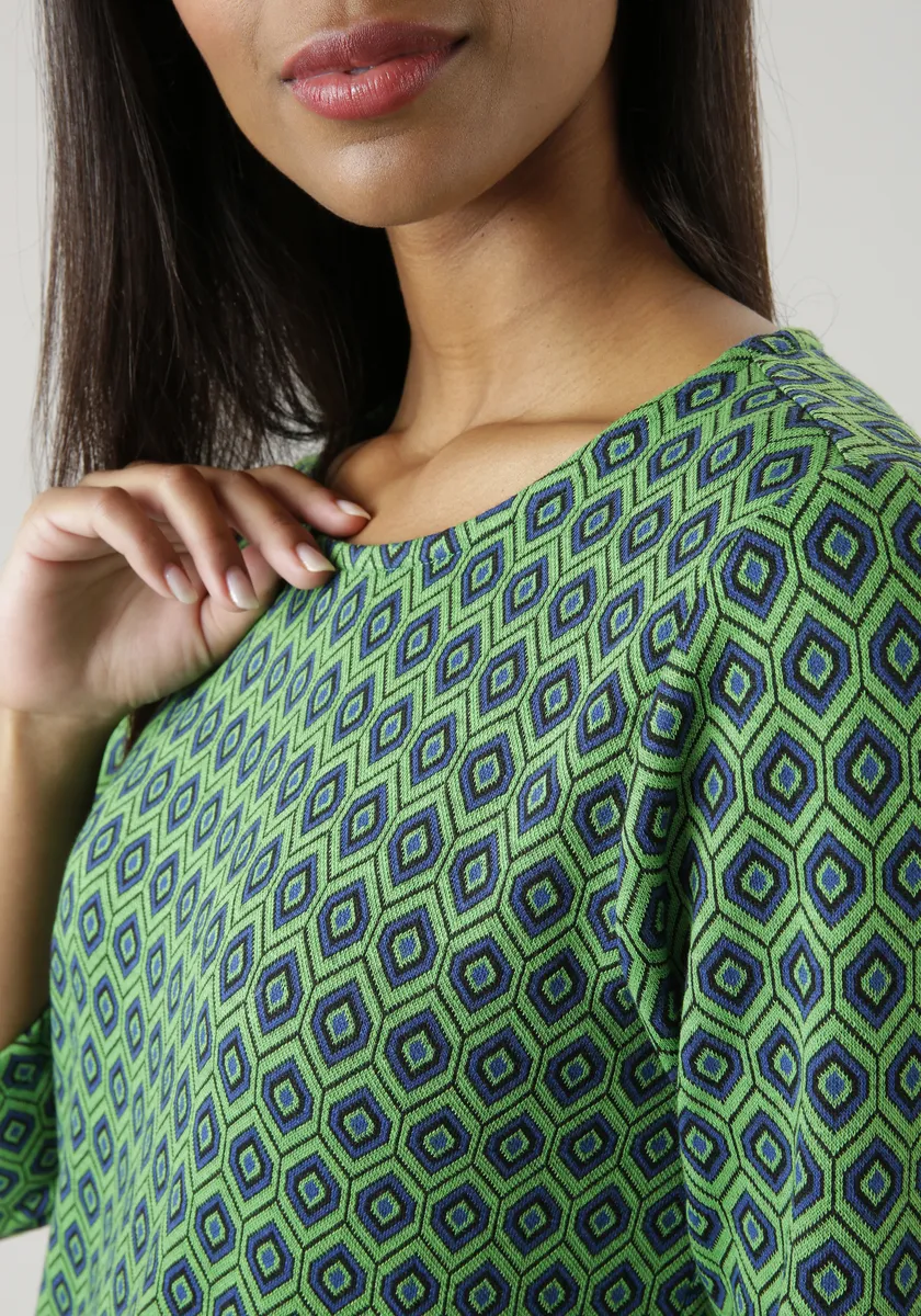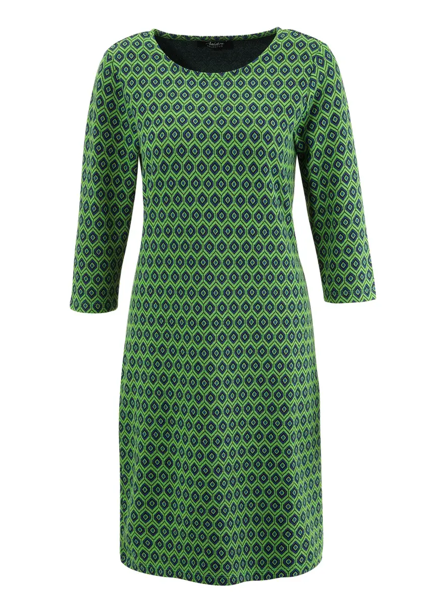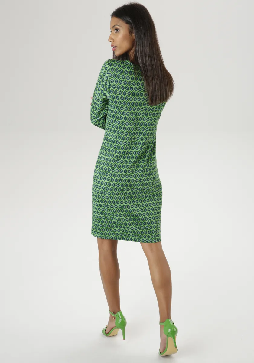 Платье от Aniston Selected с модным ретро-рисунком. С круглым вырезом, рукавами 3/4 и небольшой талией. Облегает фигуру, свободный крой. Длина в 36 размере около 92см. Эластичный жаккард высокого качества. Машинная стирка.