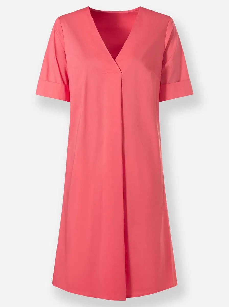 Платье Привлекательное зрелище с подчеркивающей фигуру складкой спереди на V-образном вырезе. Фиксированные манжеты на коротких рукавах, карманы в боковых швах и вытачки на талии. Поддержите инициативу «Хлопок, сделанный в Африке». 68% хлопок, 30% полиамид, 2% эластан. Машинная стирка.