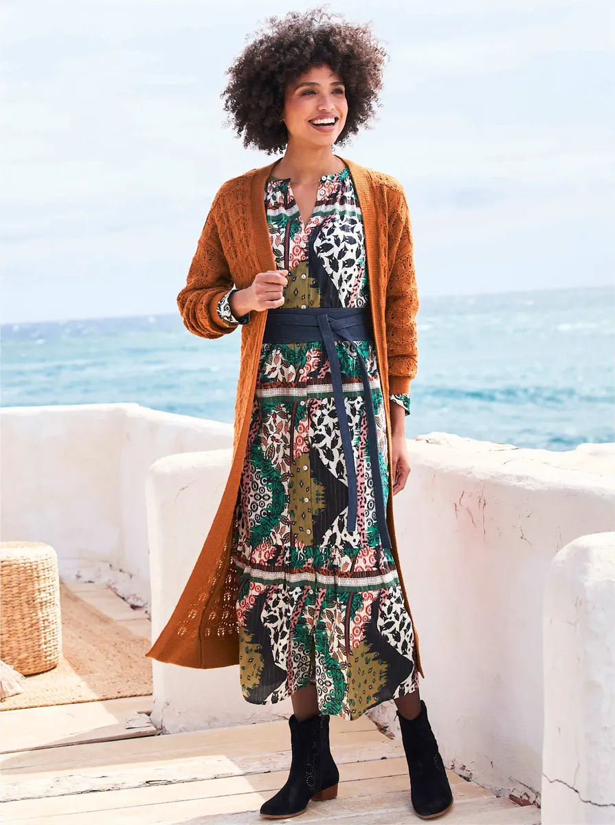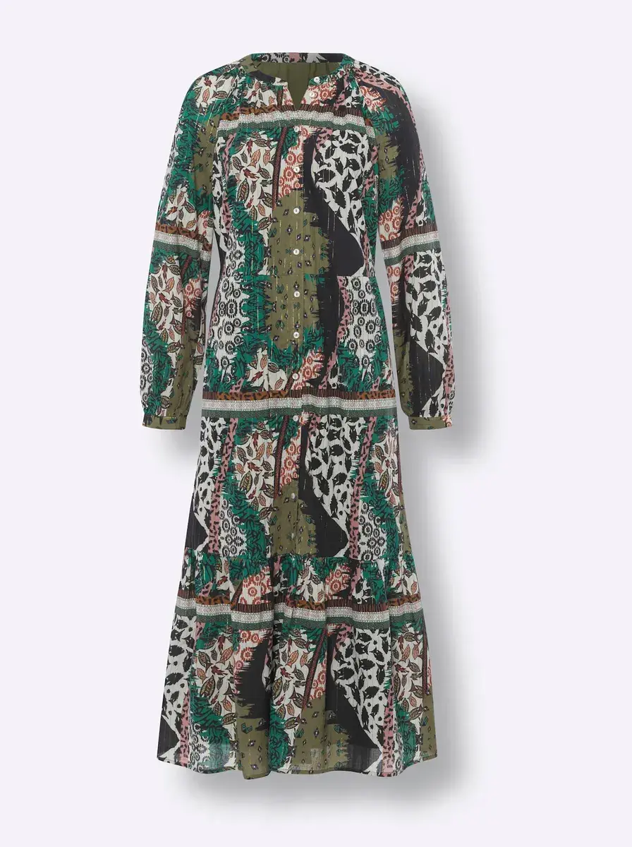 Платье с модным принтом и блестящей пряжей. Застегивается на все пуговицы, имеет круглый вырез горловины, шов на талии и свободную оборку. Длинные рукава-фонарики с узкими манжетами на пуговицах. Поддержите инициативу «Хлопок, сделанный в Африке». 99% хлопок, 1% металлизированное волокно. Подкладка: 100% вискоза. Машинная стирка.