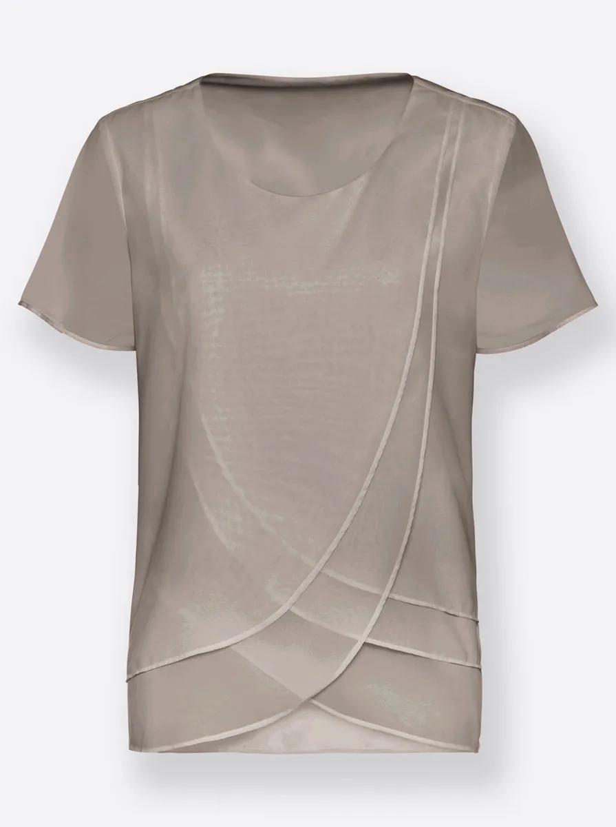 Такая красивая и женственная: блузка из неприхотливого в уходе жоржета. Закругленные слои спереди разной длины создают привлекательный и прекрасно скрытый вид. Двухслойная спинка заканчивается прямым подолом. С круглым вырезом, чуть шире, короткими рукавами и вытачками на груди. 100% полиэстер. Машинная стирка.